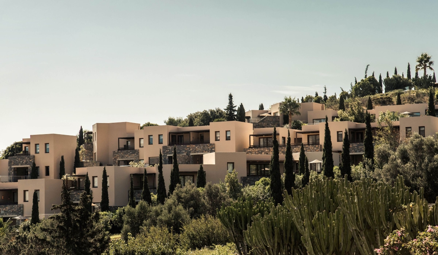 Stone pathways link 28 hillside bungalows and 18 suites, most with heated pools, all framed by indigenous gardens and Aegean views.
