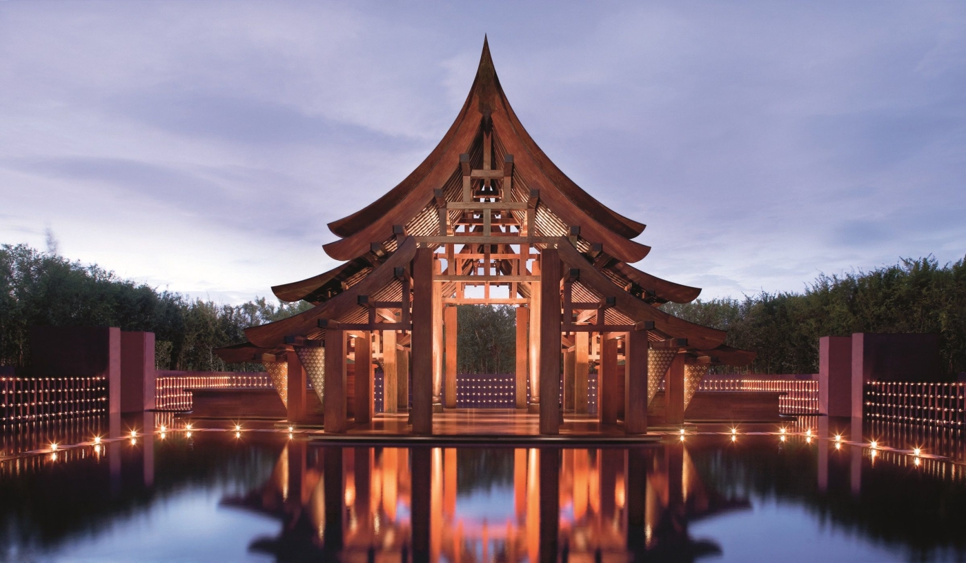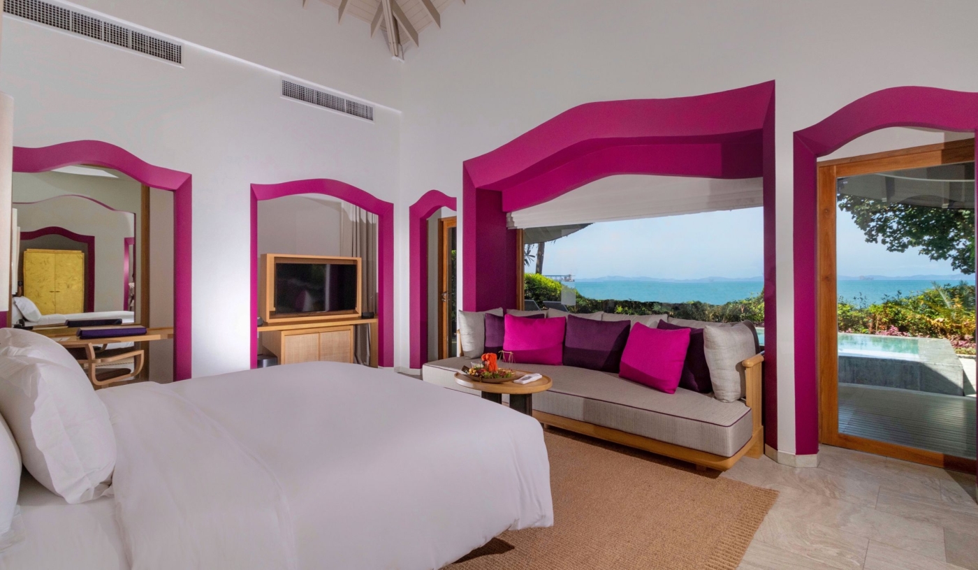 Guests are welcomed at a traditional Thai pavilion and stay in spacious suites or villas with gardens, sea views, private pools, or beach access