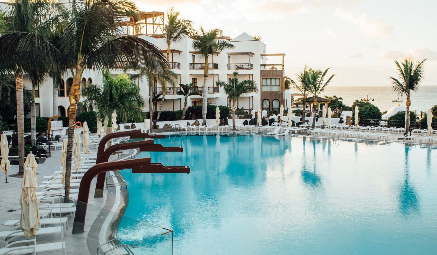 Bright white architecture and palm-lined pools set the tone for laid-back luxury on Lanzarote’s golden south coast.