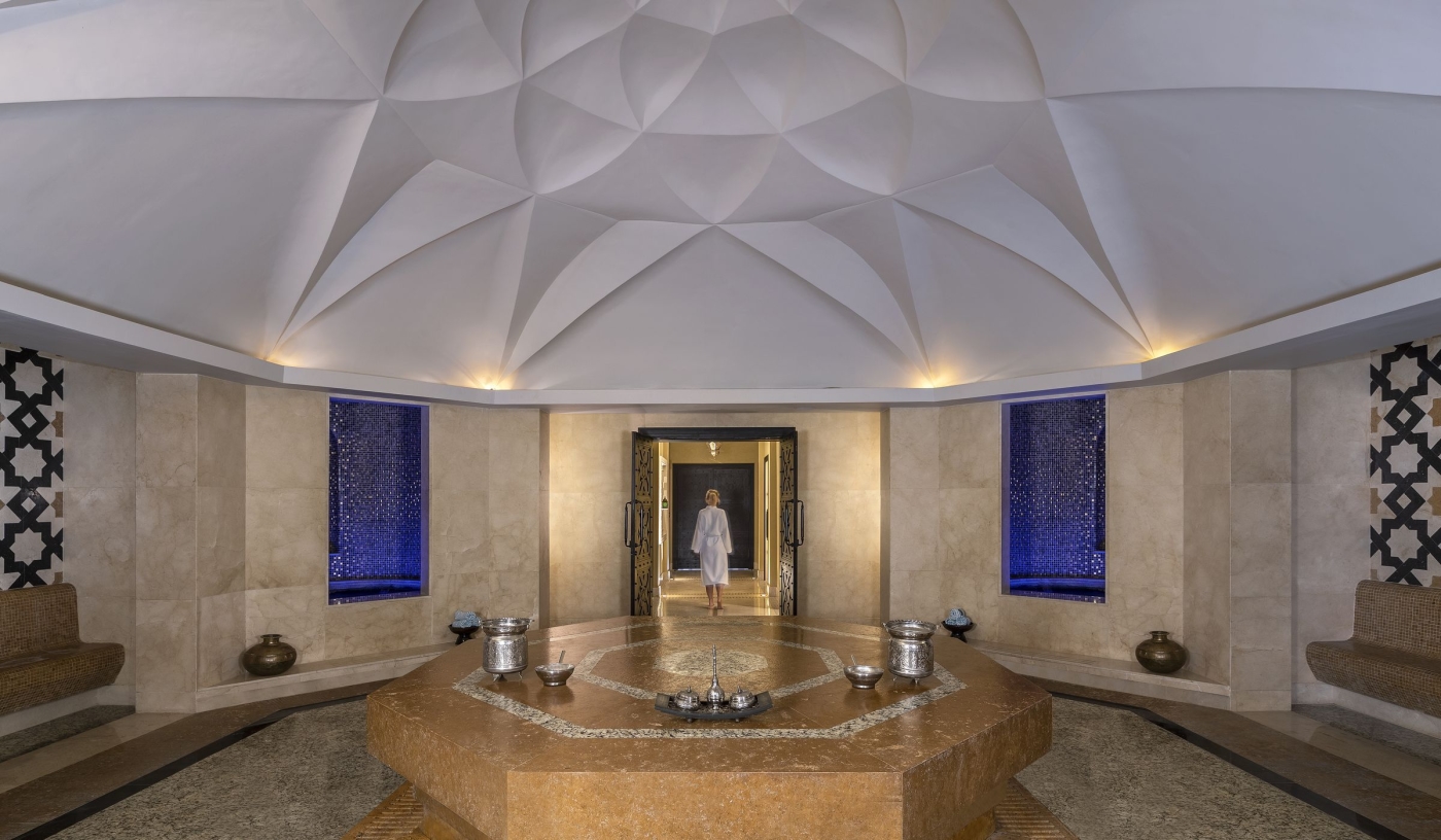 The tranquil spa boasts a hammam and five treatment suites while signature treatments use Arabian rose milk and poultices made from Rub Al Khali sand