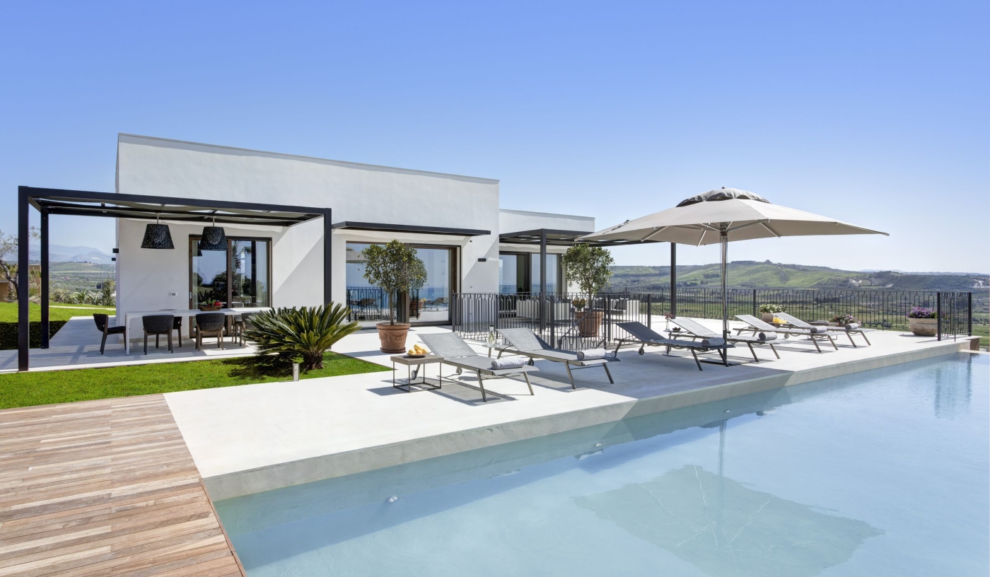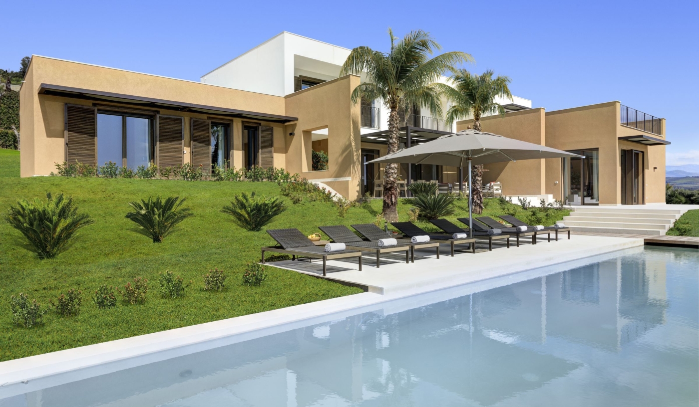 These hillside hideaways offer three to four bedrooms, sleek interiors, private pools and sunset views over Sicily’s olive groves and the Mediterranean Sea.