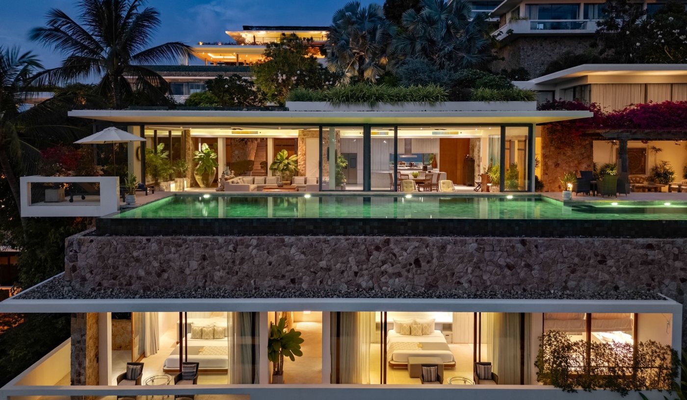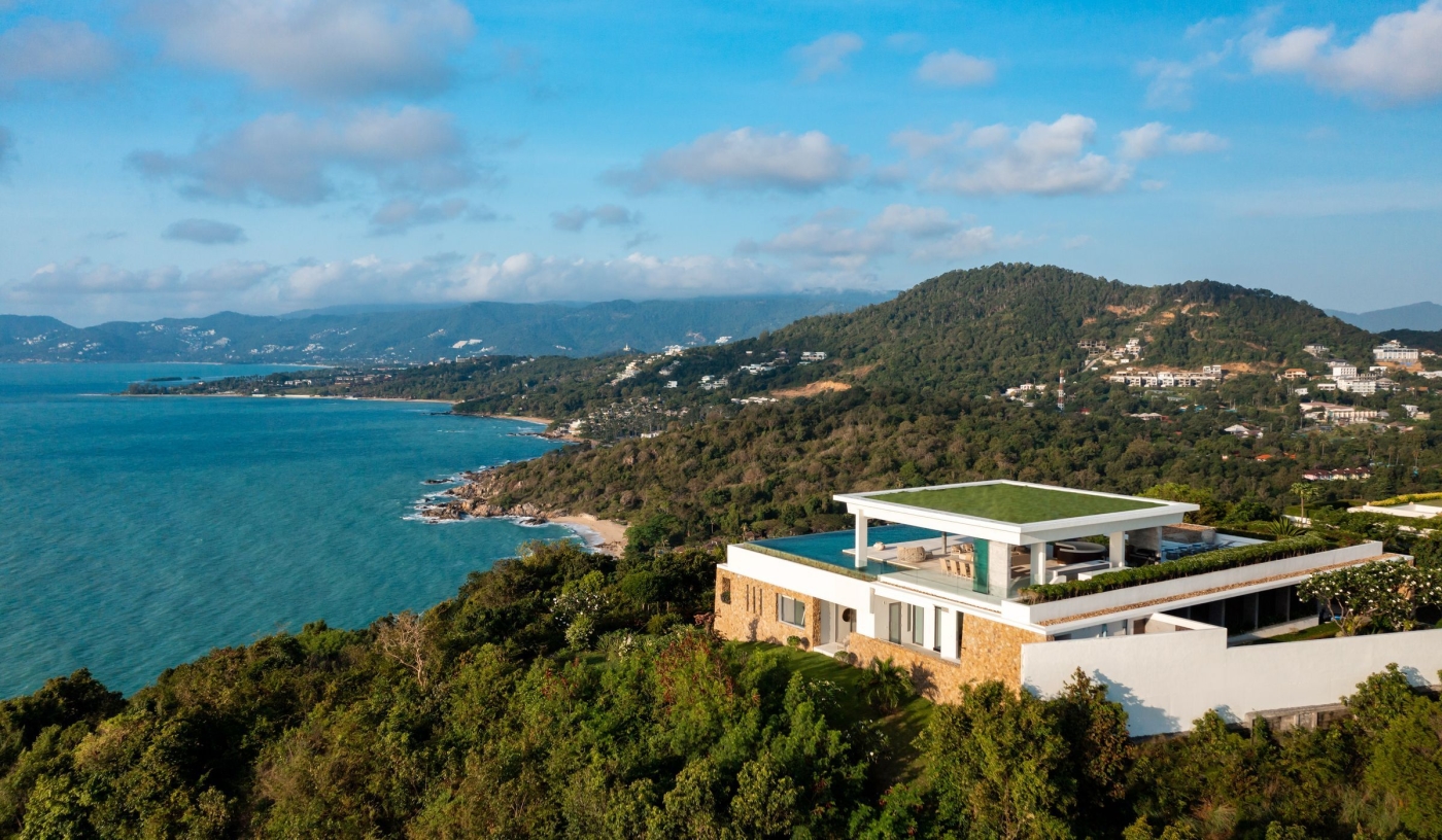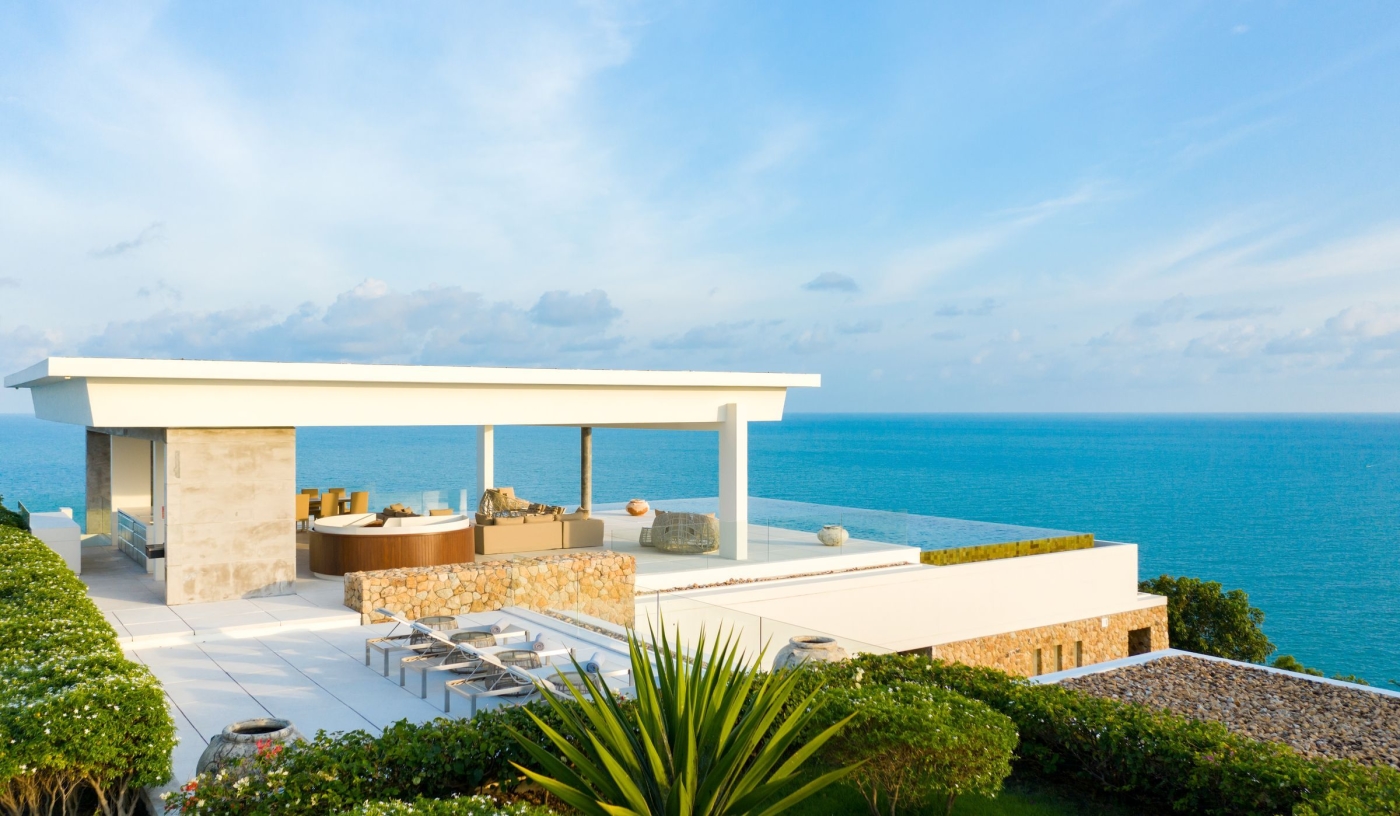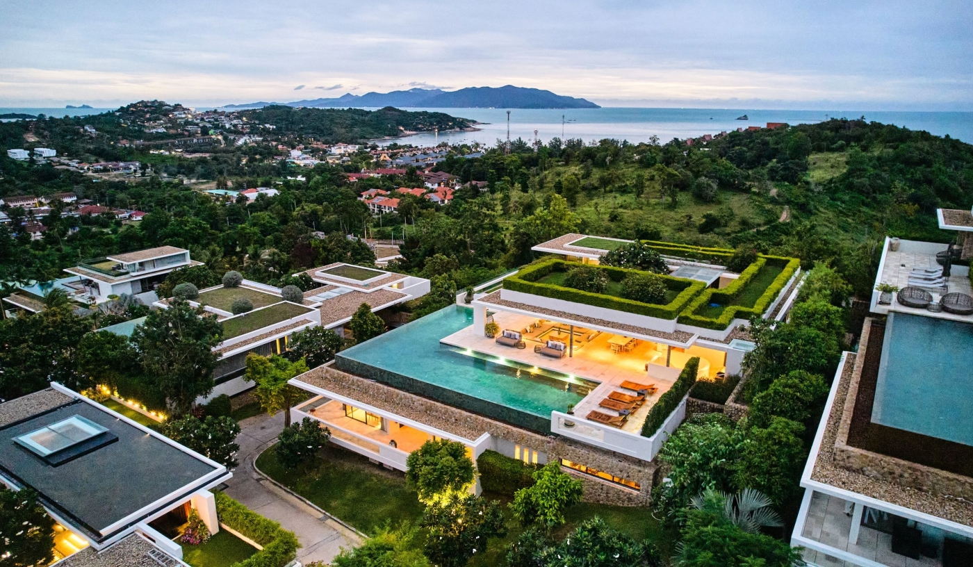 Choose from 23 modern Thai villas with 3–8 bedrooms, private pools, and panoramic Gulf of Thailand views