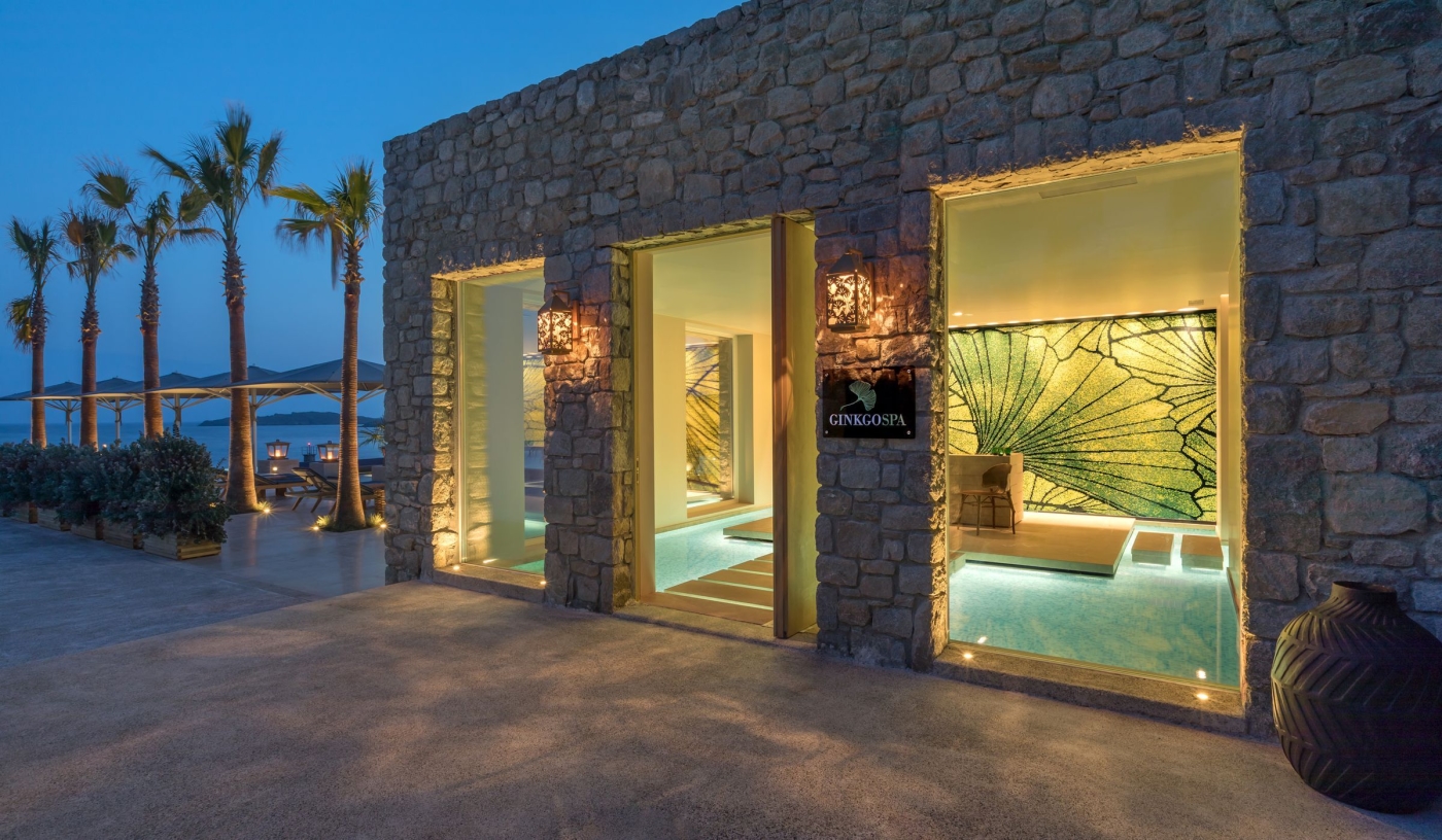 The Ginkgo Spa offers five treatment rooms, including a couple’s suite, and the only traditional hammam on Mykonos.