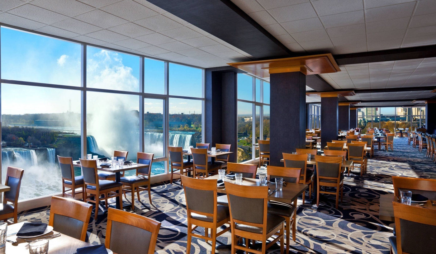 Fallsview rooms offer uninterrupted views of both falls, with floor-to-ceiling windows and a front-row seat to evening fireworks.