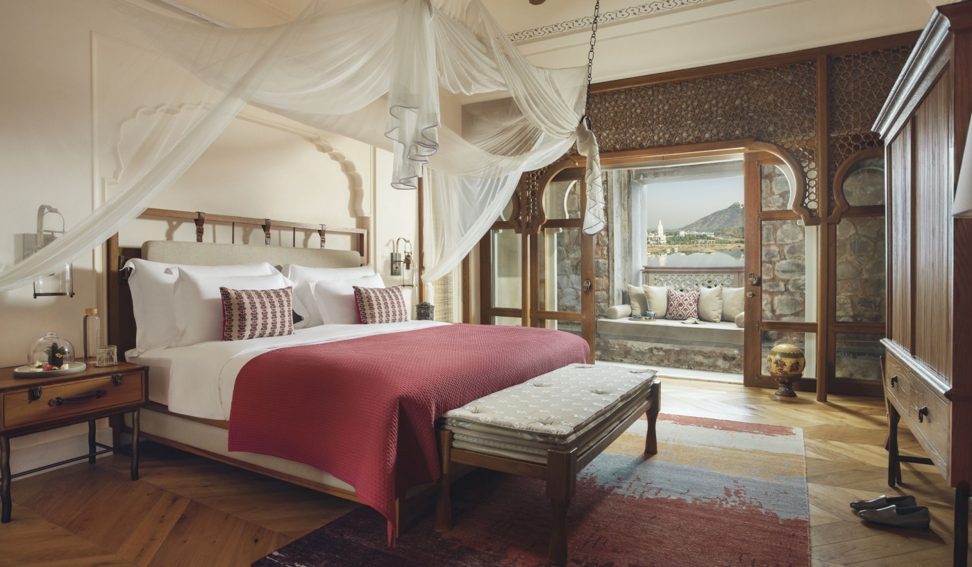 Floating like a dream on Lake Pichola, the iconic Taj Lake Palace in Udaipur offers a rare blend of Mughal-inspired romance and refined hospitality, with ornate suites, candlelit dining, butler service and panoramic views of the Aravalli Hills and City Palace.