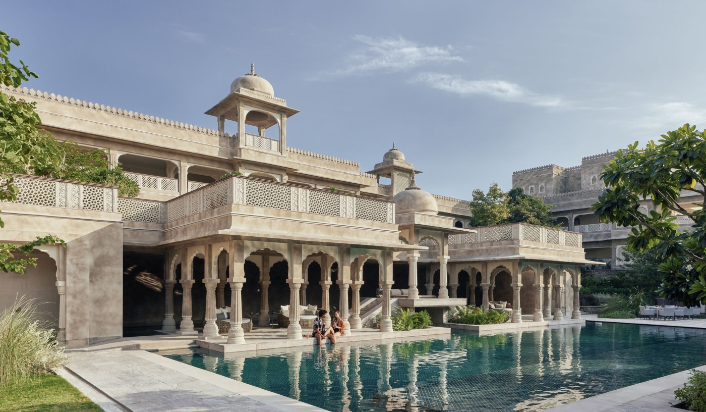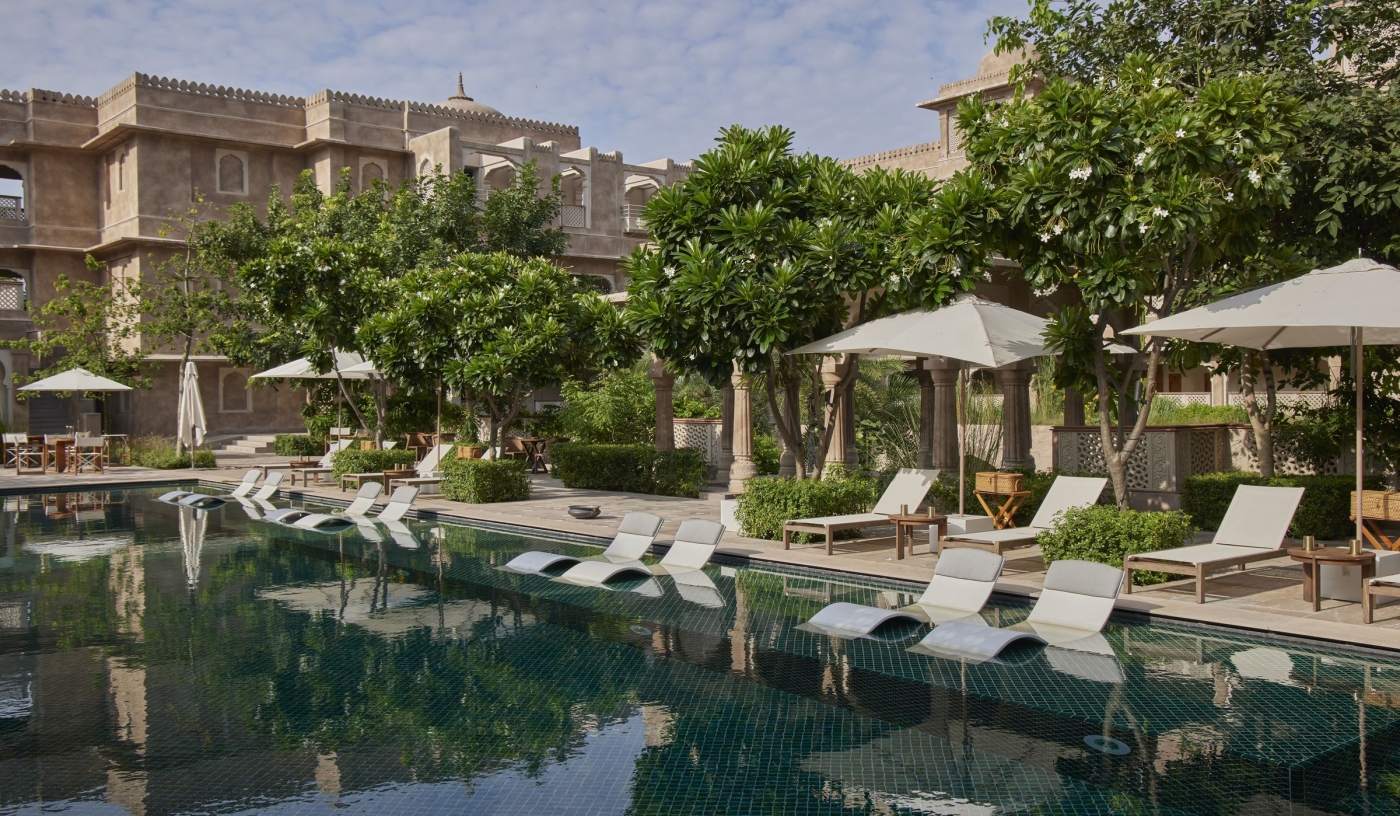 Tucked among the Aravalli Hills, Amanbagh is a lush, rose-hued oasis built on the grounds of a former Mughal hunting lodge, where domed pavilions, serene courtyards, Ayurvedic rituals and immersive cultural journeys offer a deeply restorative escape into rural Rajasthan.