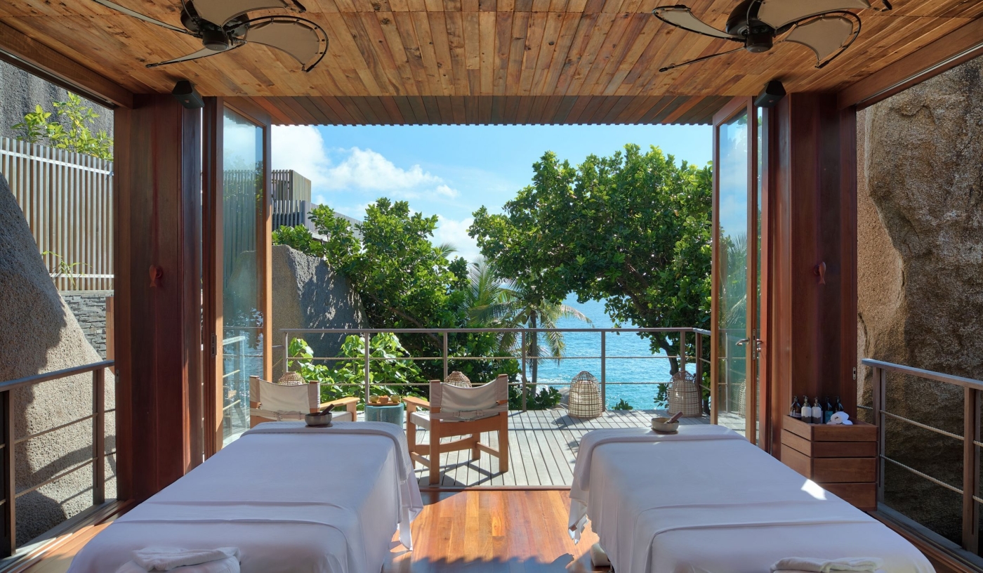 The stunning spa is built into the Seychelles’ iconic granite boulders and boasts five double treatment rooms, an oceanfront pool, sundeck and meditation/yoga pavilion