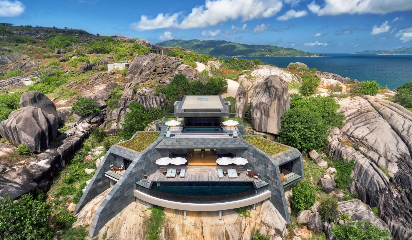 The ultimate places to stay are the three- and four-bedroom Bond-lair-like residences, with glass-bottomed pools, cavernous living quarters and private staff