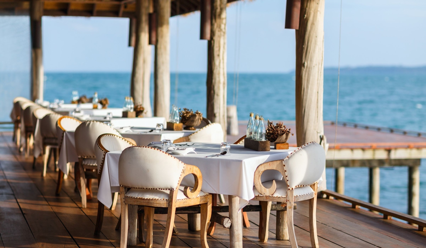 Gourmet Khmer-inspired cuisine is served in showpiece locations. On the deck over the ocean, on the beach, in the jungle on Koh Bong island or by the pool under the stars
