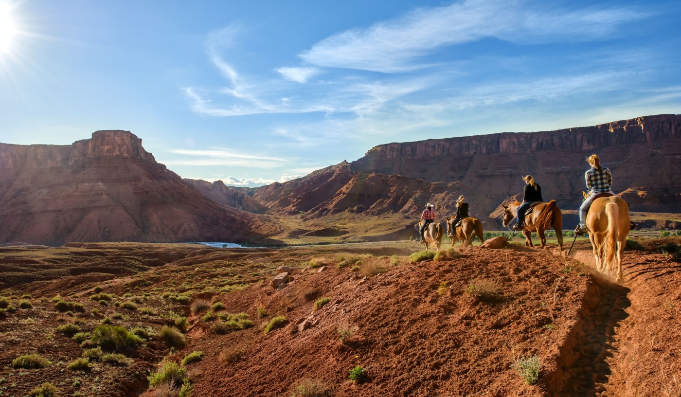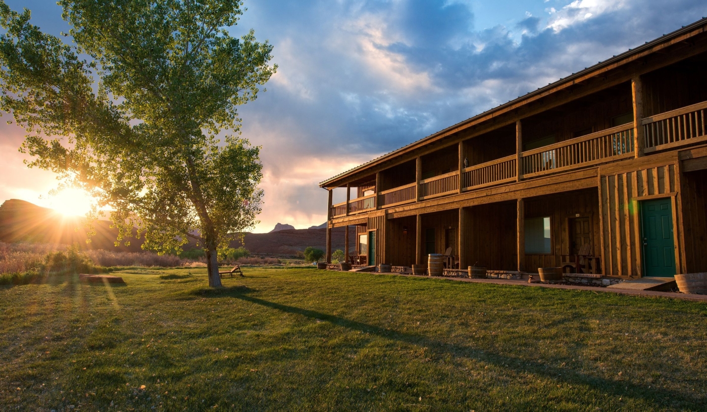 Set along the Colorado River, the ranch offers views of the La Sal Mountains and the dramatic cliffs of Professor Valley.