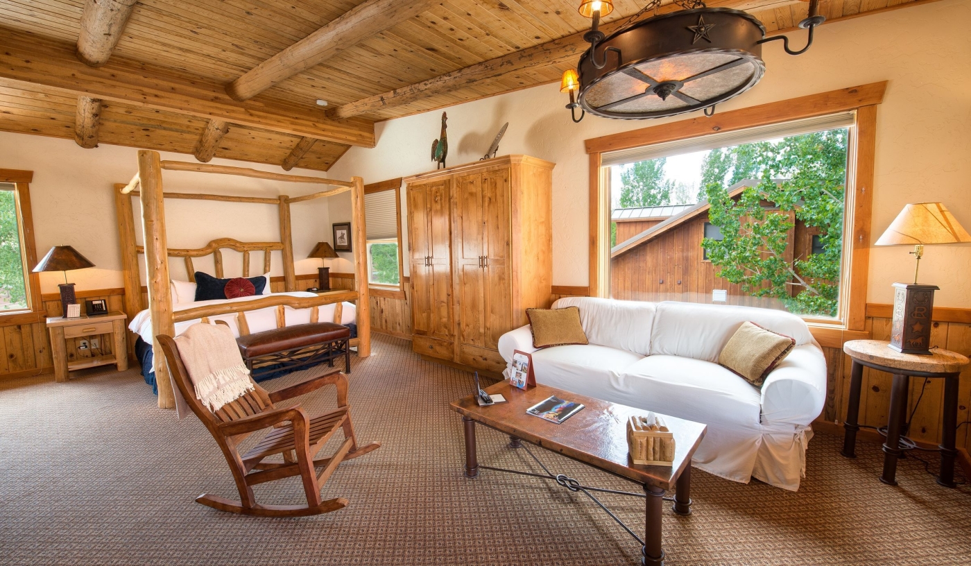 Studios and suites are cabin-style, with wooden furnishings, large windows and private decks looking onto the river or mountains.