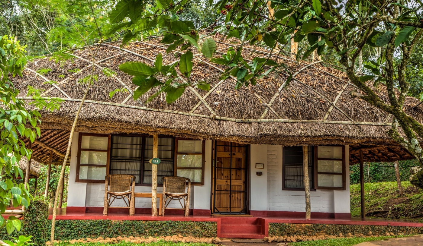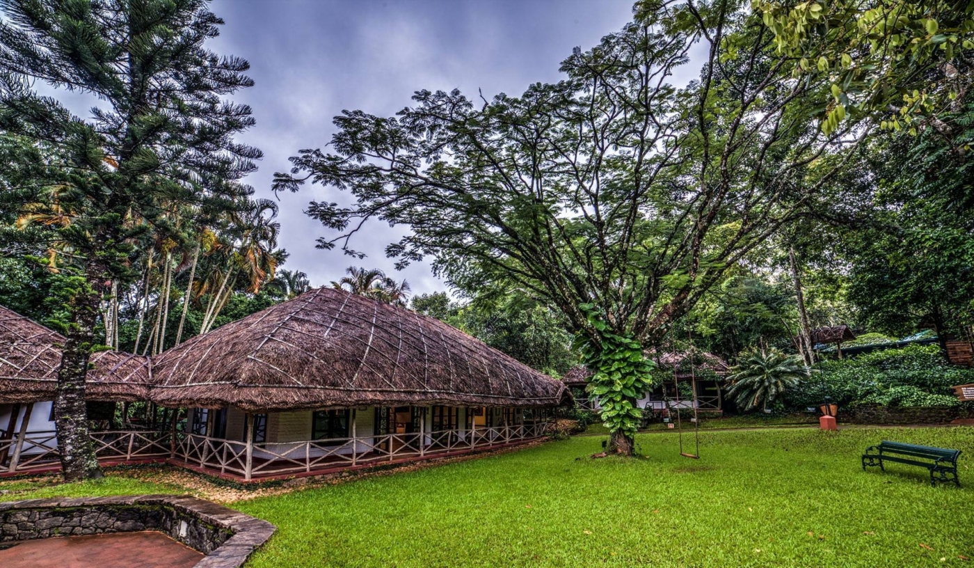 Inspired by the architecture of the native Mannan tribe, Spice Village is an eco-resort in Thekkady where traditional thatched cottages, organic gardens and sustainable living come together beside the Periyar Wildlife Reserve, creating a quiet retreat rooted in nature.