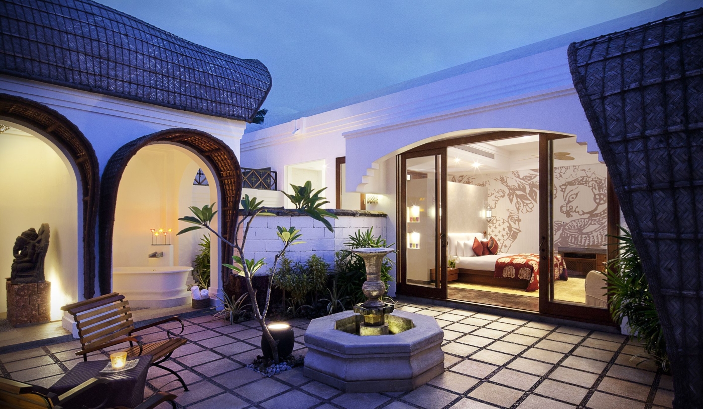 Houseboat-inspired villas offer tranquil courtyards, open-air baths and private plunge pools just steps from the beach.