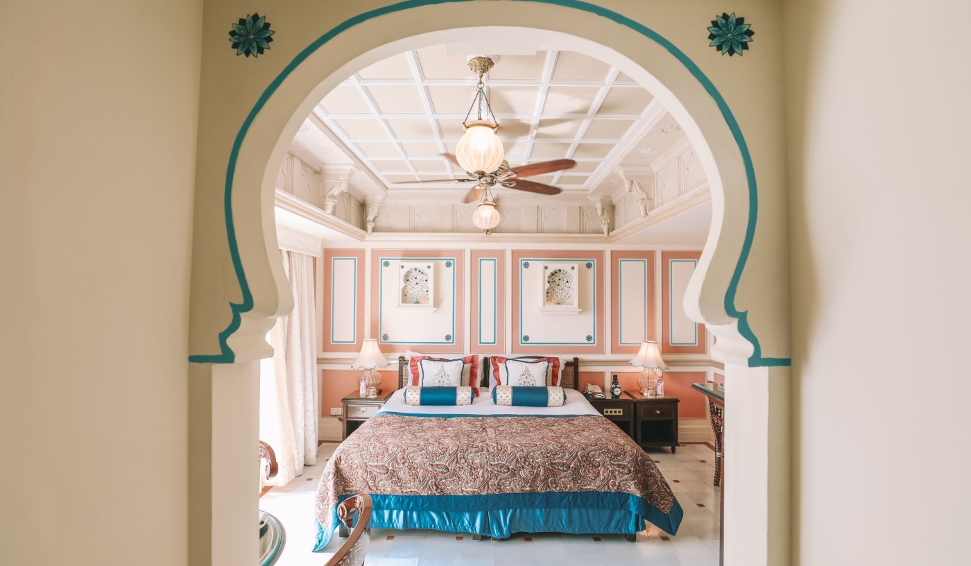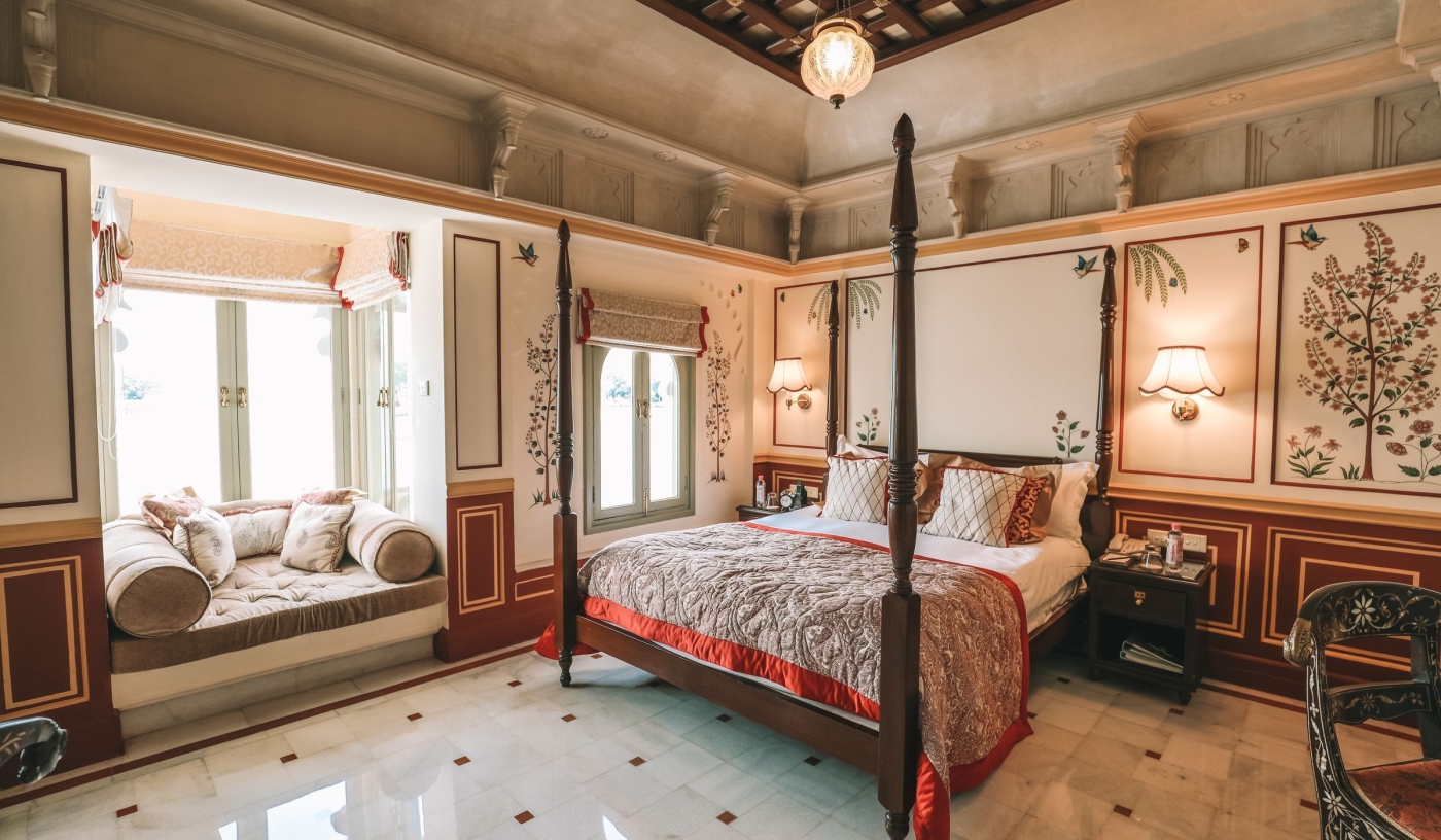 Floating like a dream on Lake Pichola, the iconic Taj Lake Palace in Udaipur offers a rare blend of Mughal-inspired romance and refined hospitality, with ornate suites, candlelit dining, butler service and panoramic views of the Aravalli Hills and City Palace.
