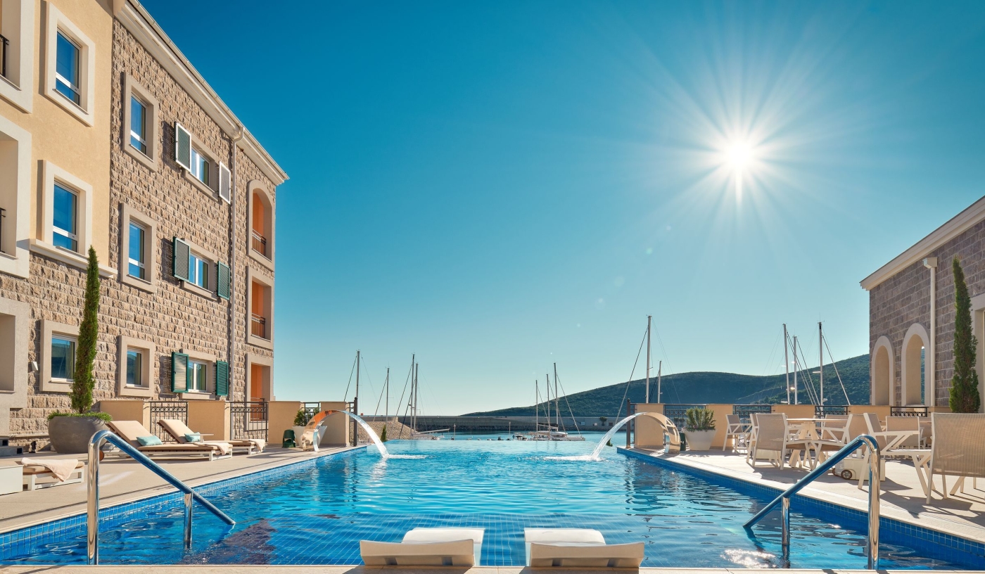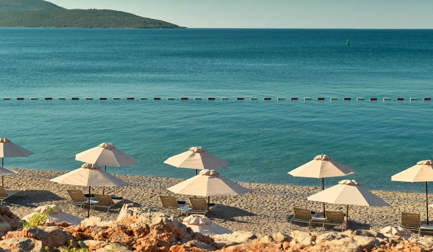 The hotel’s private beach and two serene pools offer space to swim, sunbathe and soak up the dramatic Montenegrin coastline.