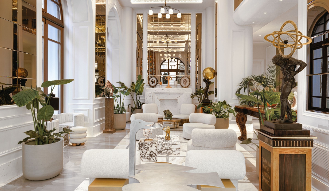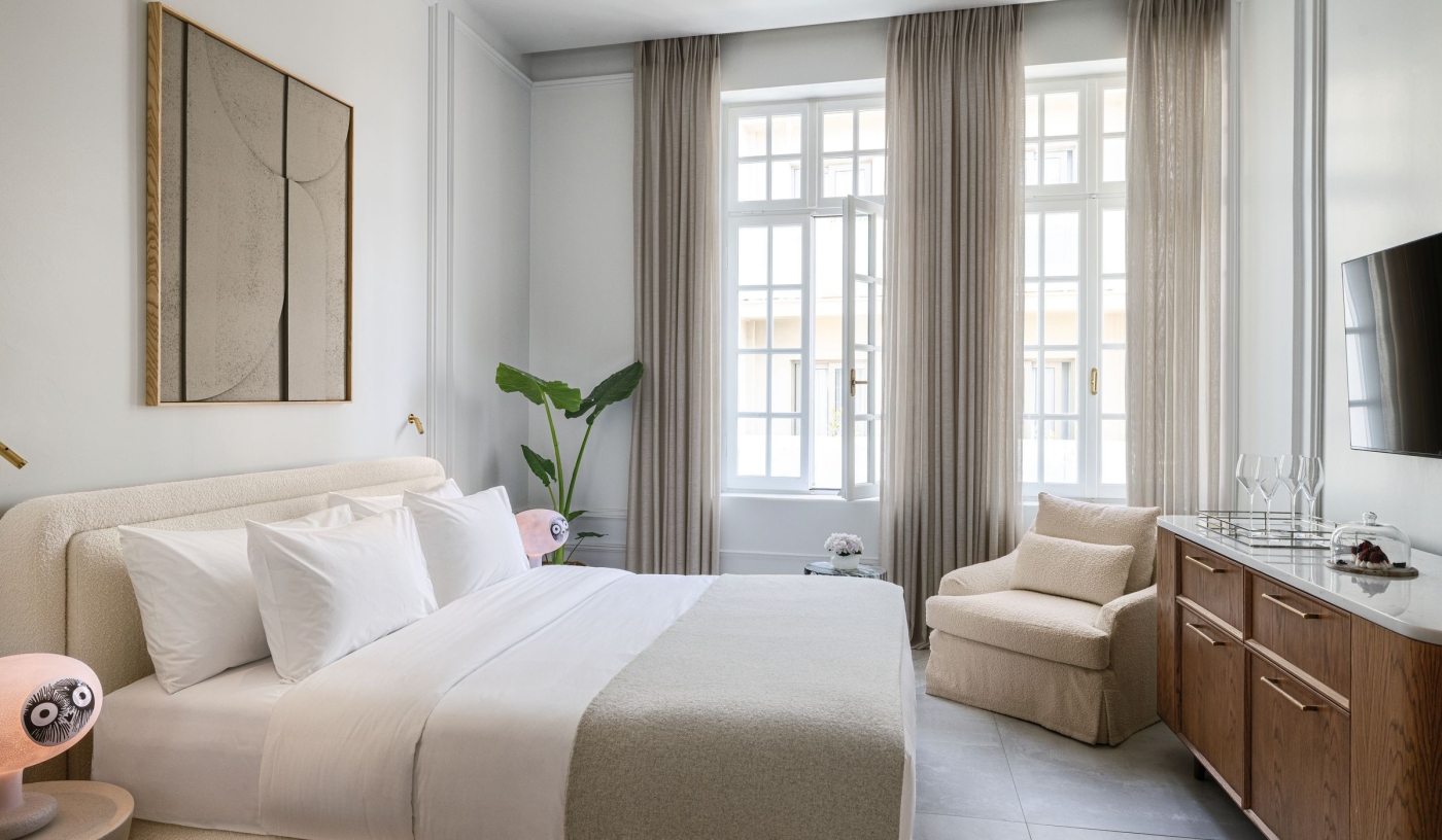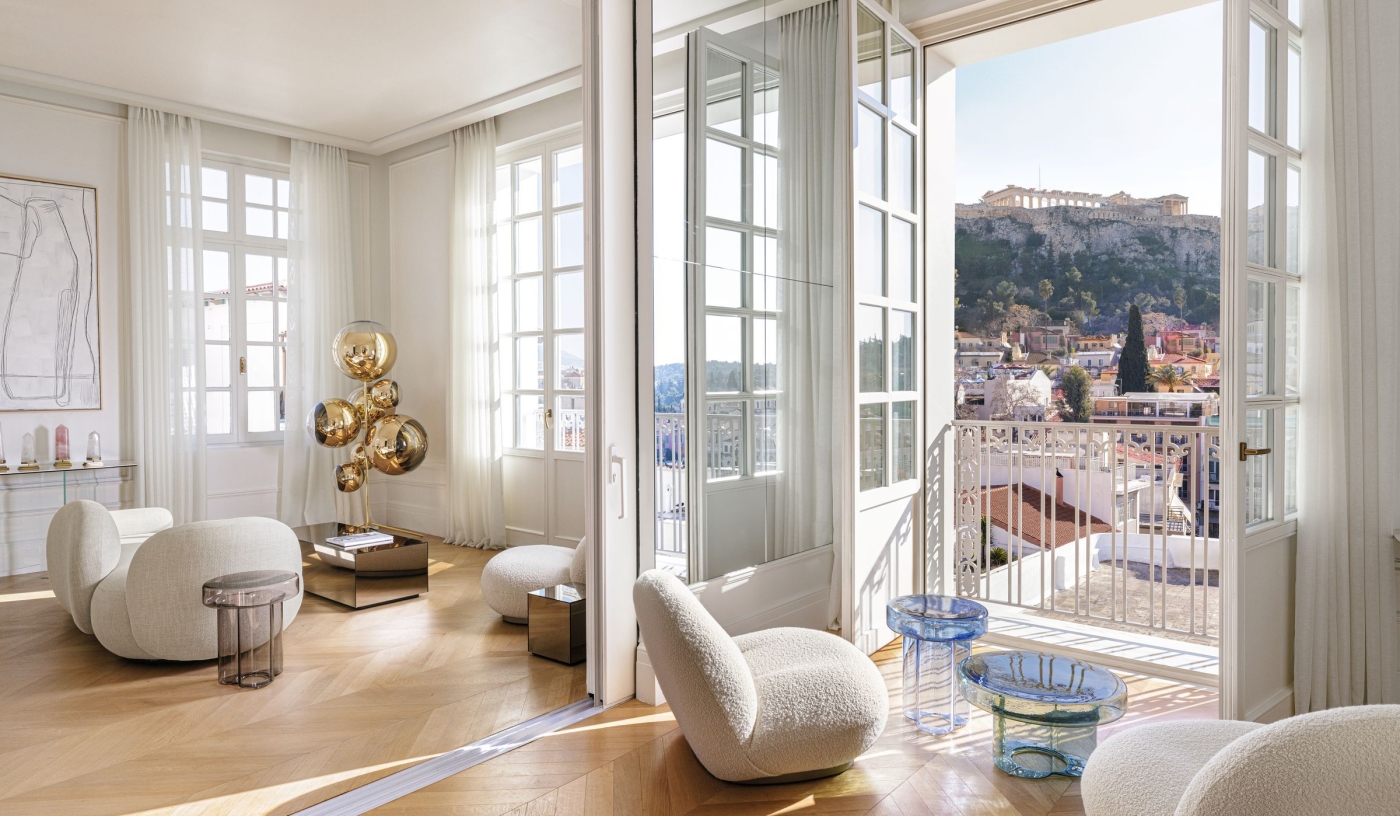 Interiors feature high ceilings, marble bathrooms and large windows, with Acropolis views in select room categories.