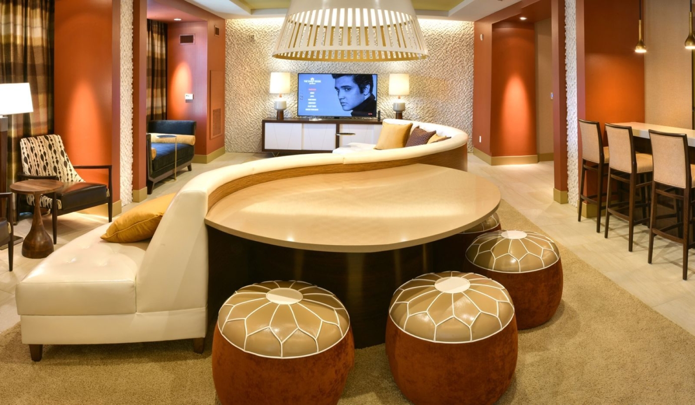 Just steps from Elvis’s iconic mansion, this 450-room retreat immerses guests in Memphis magic with subtle Presley-inspired design.
