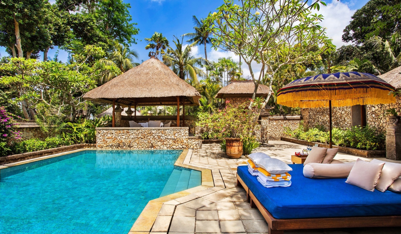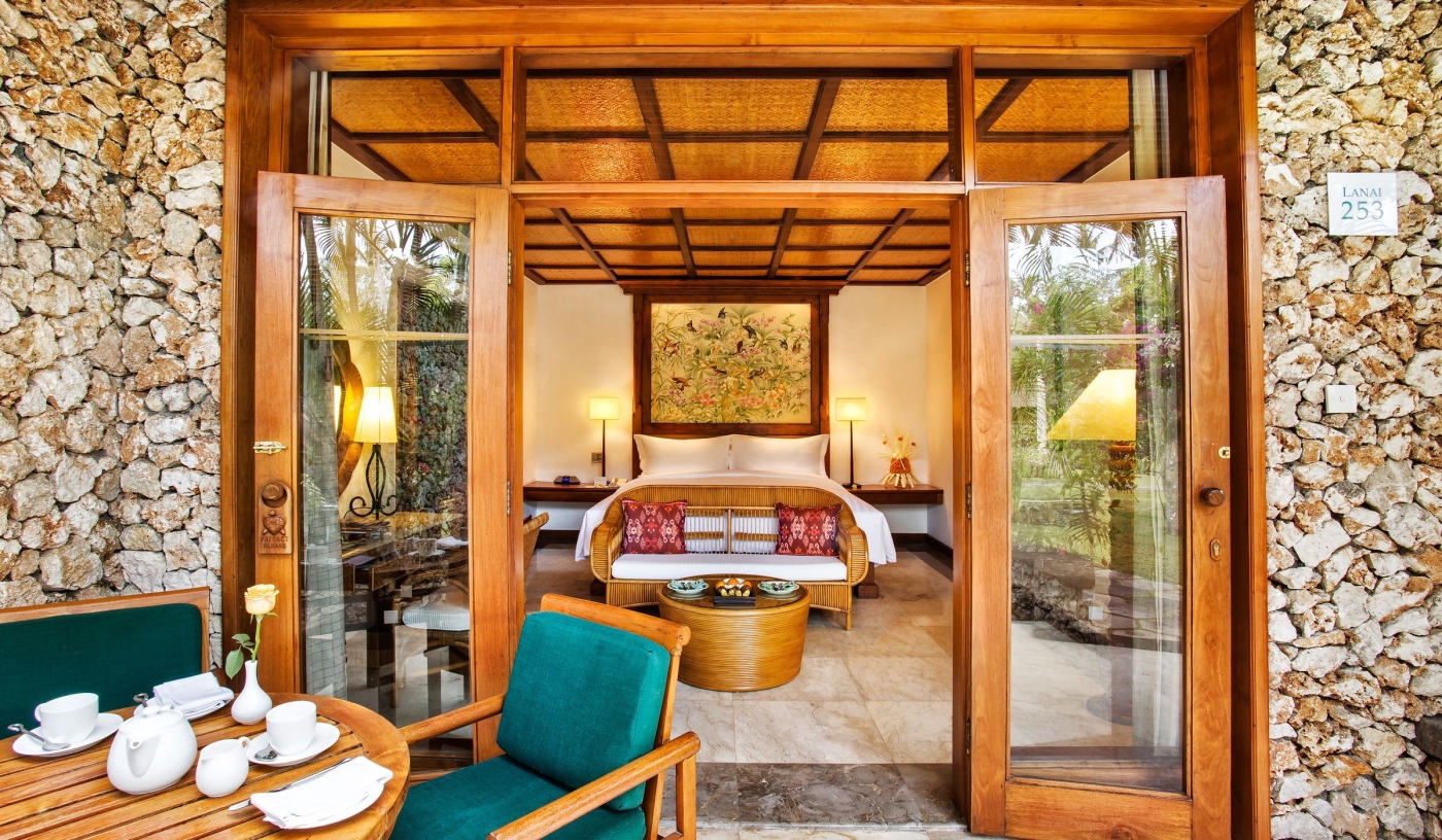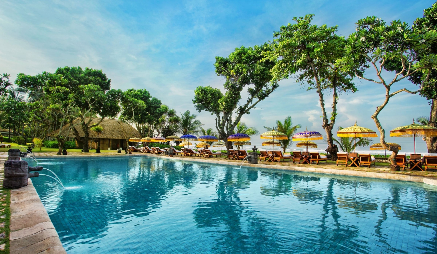 One of Bali's original luxury resorts, traditional thatch and natural stone rooms and villas are set in extensive tropical gardens
