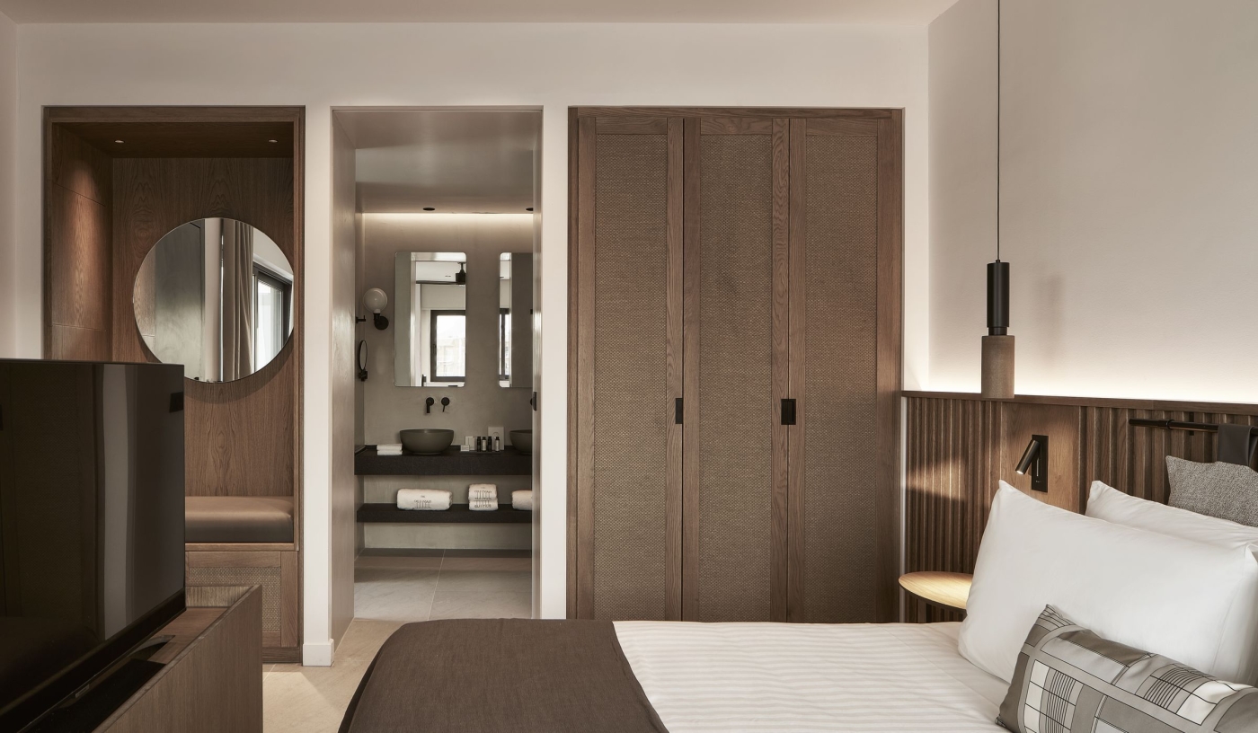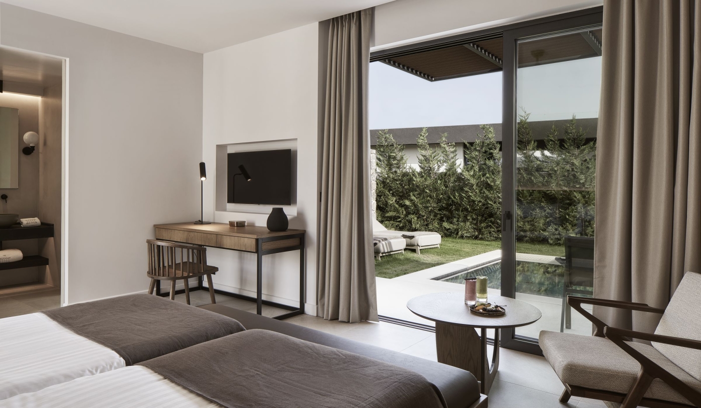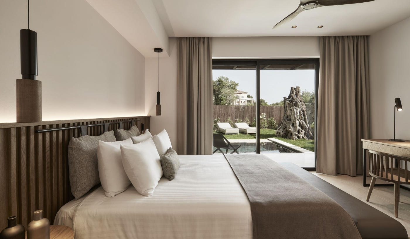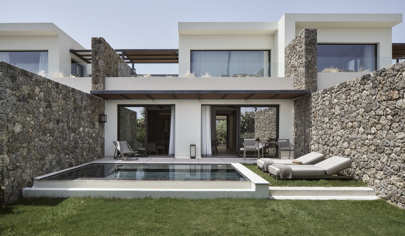 Suites are set among olive trees, each with either a private pool and garden or a sundeck designed for open-air living.
