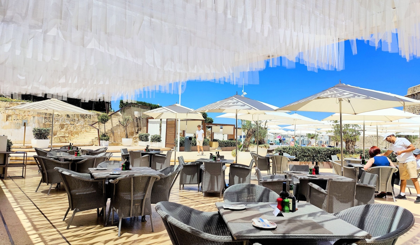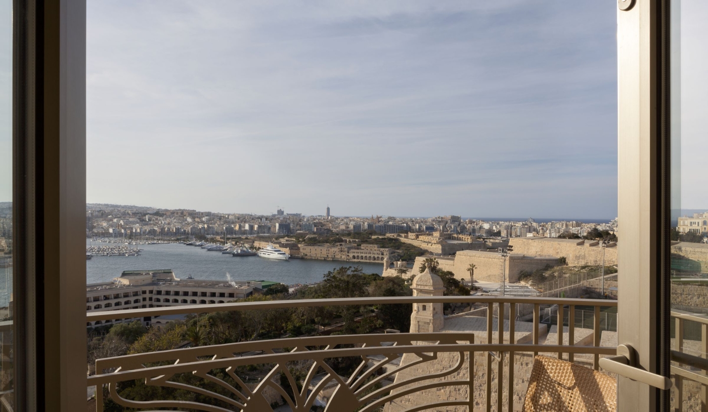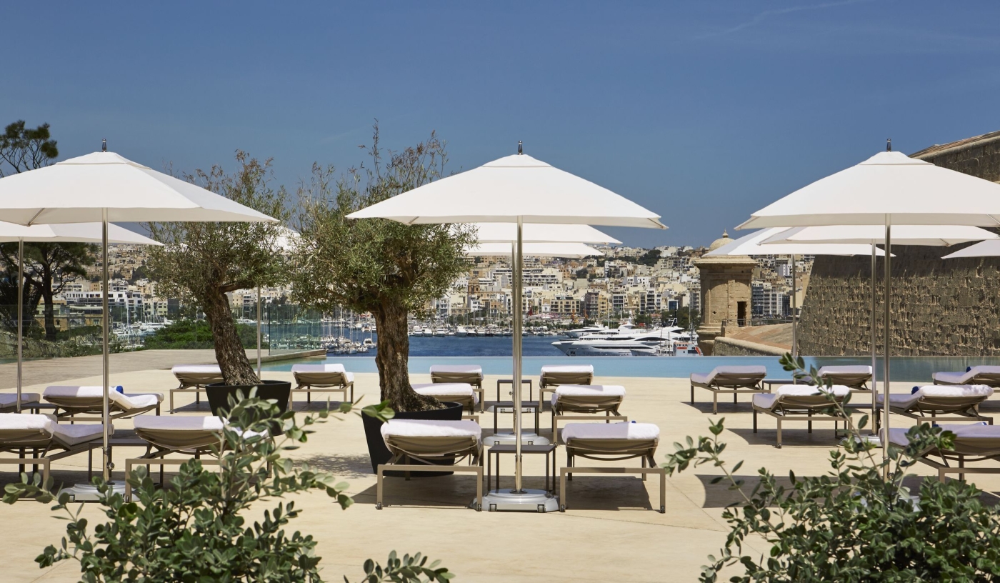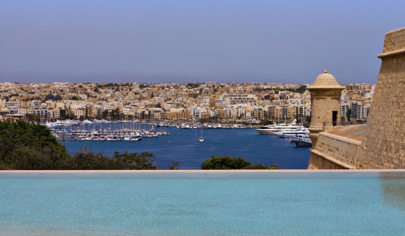 The infinity pool has one of the city’s best views, set above the harbour with direct sightlines to Valletta’s historic fortifications.