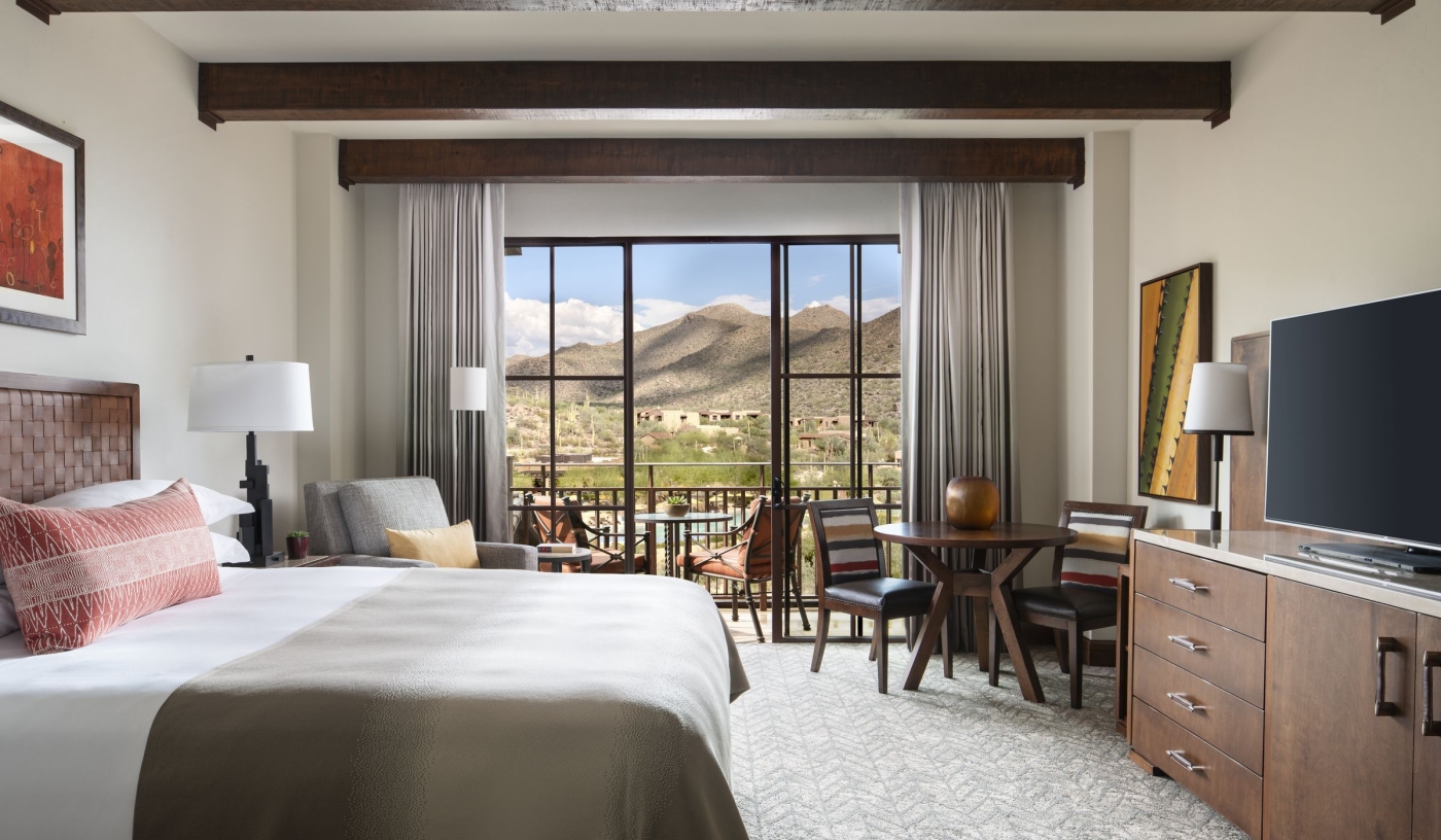 Spacious rooms and suites look out to open mountain views, each finished with natural stone and warm wood tones.