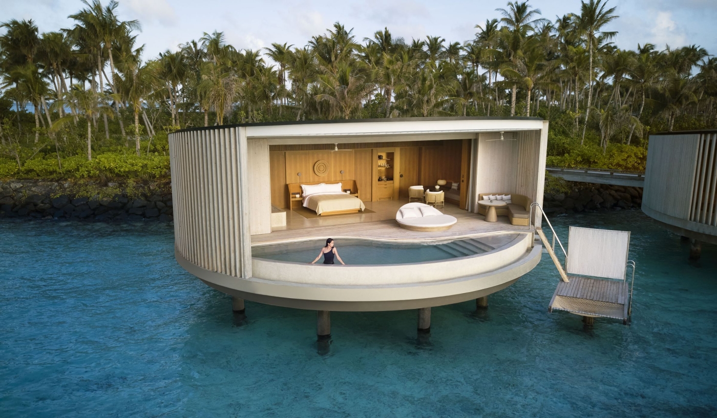 Circular one-bed villas are scattered above the water and along the white-sand beach, their glass doors opening onto half-moon decks and teardrop-shaped plunge pools