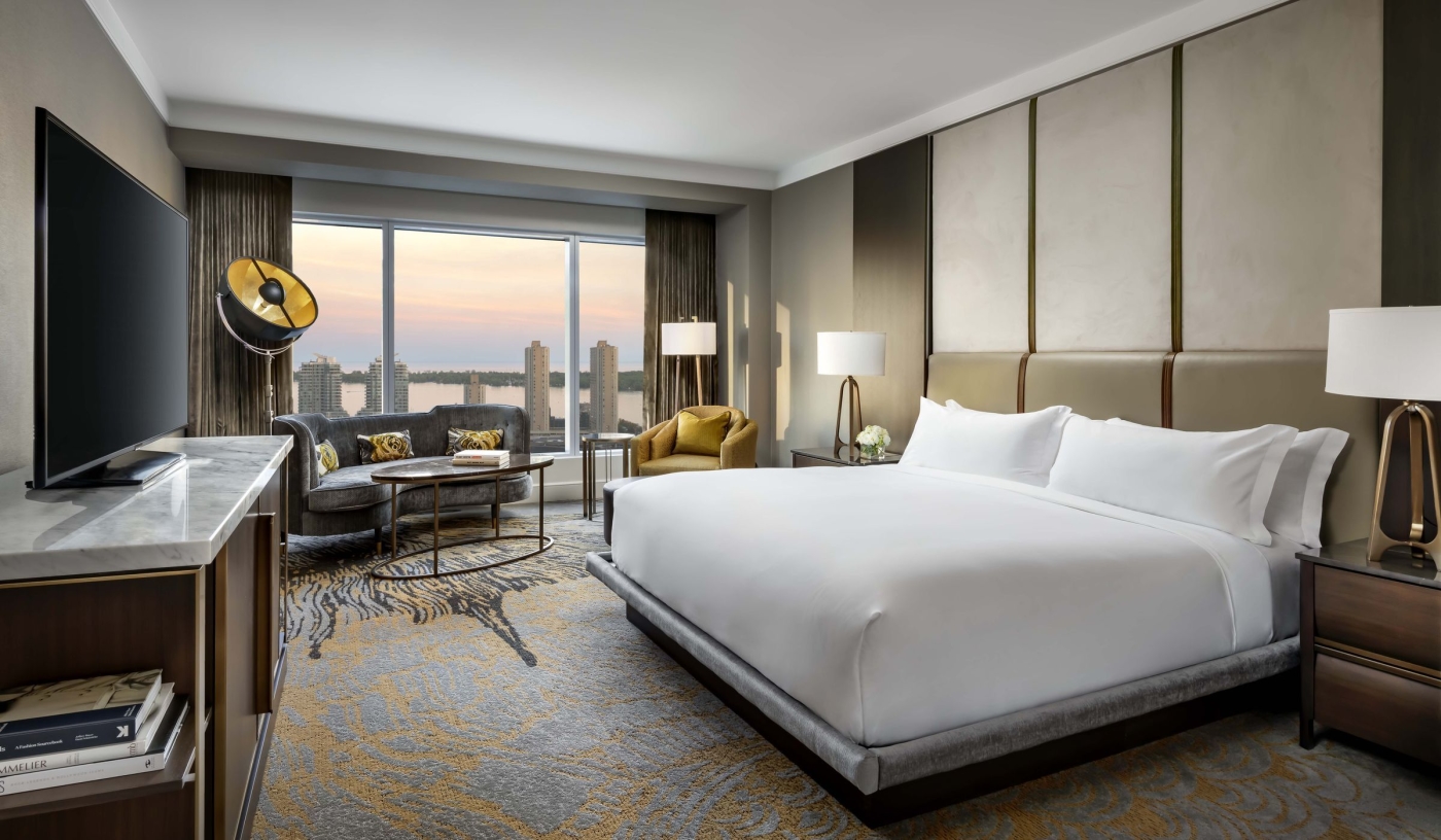 Spacious rooms and suites feature deep-soaking tubs, skyline views and subtle, sophisticated design with Italian marble finishes