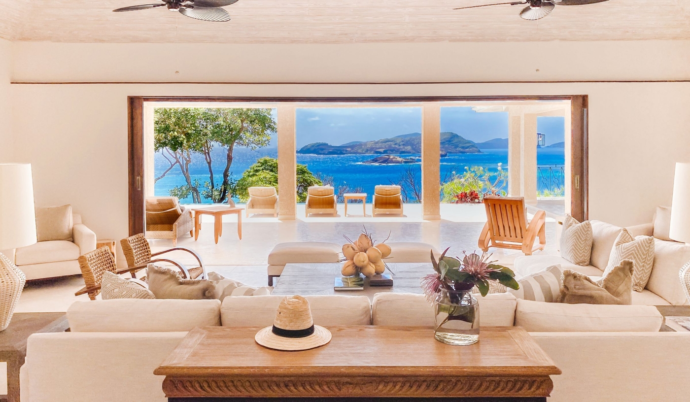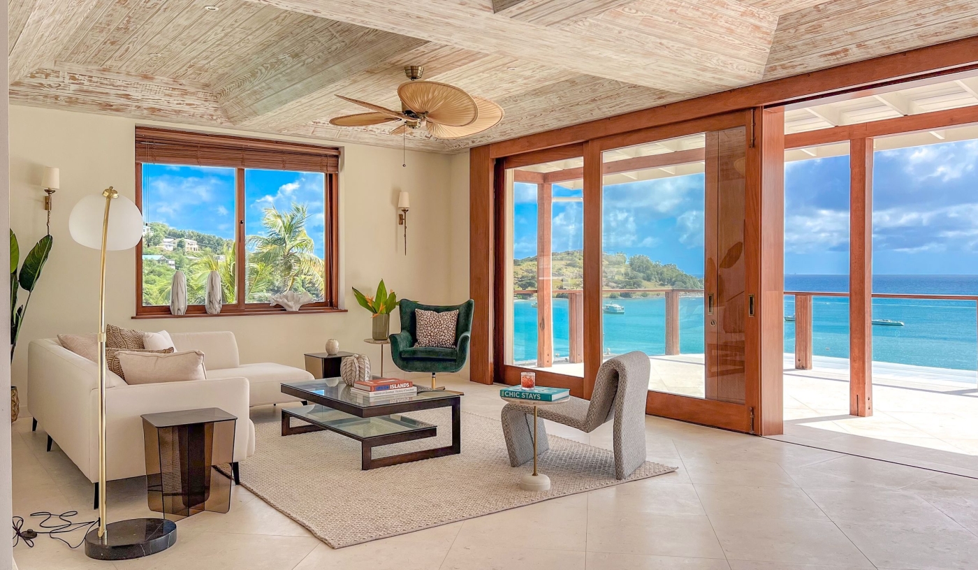 Soaring above the bay, this breezy hillside villa captures 180° ocean views and the gentle rhythm of island life