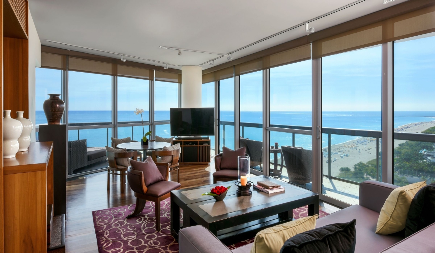 Interiors draw on Asian design influences, creating a calm contrast to Miami’s lively beachfront setting.