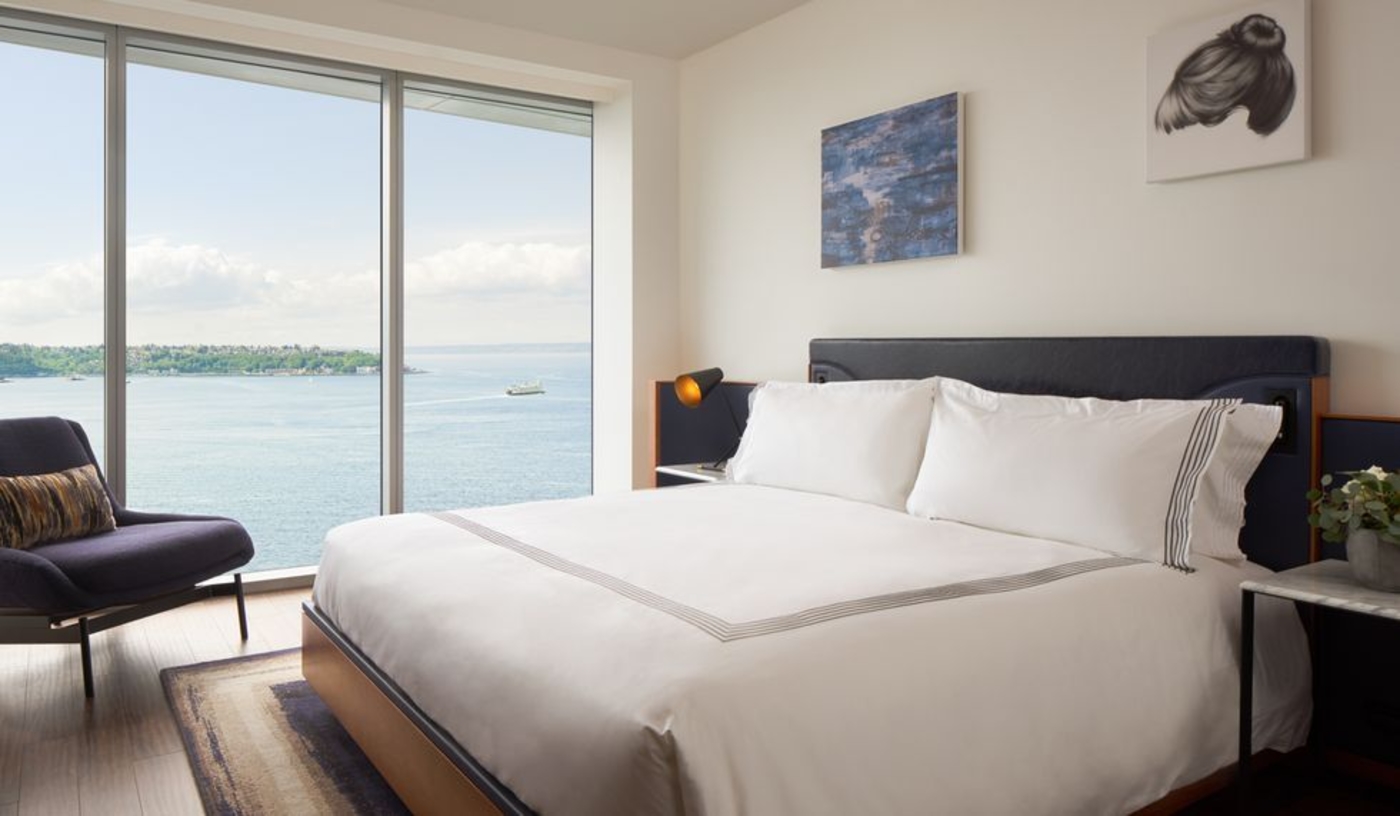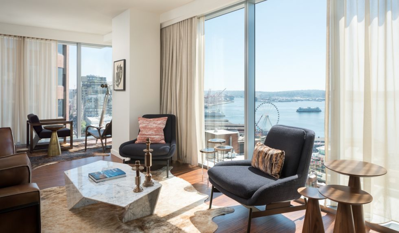 Rooms, suites and residences feature floor-to-ceiling windows with views of Puget Sound and the city skyline