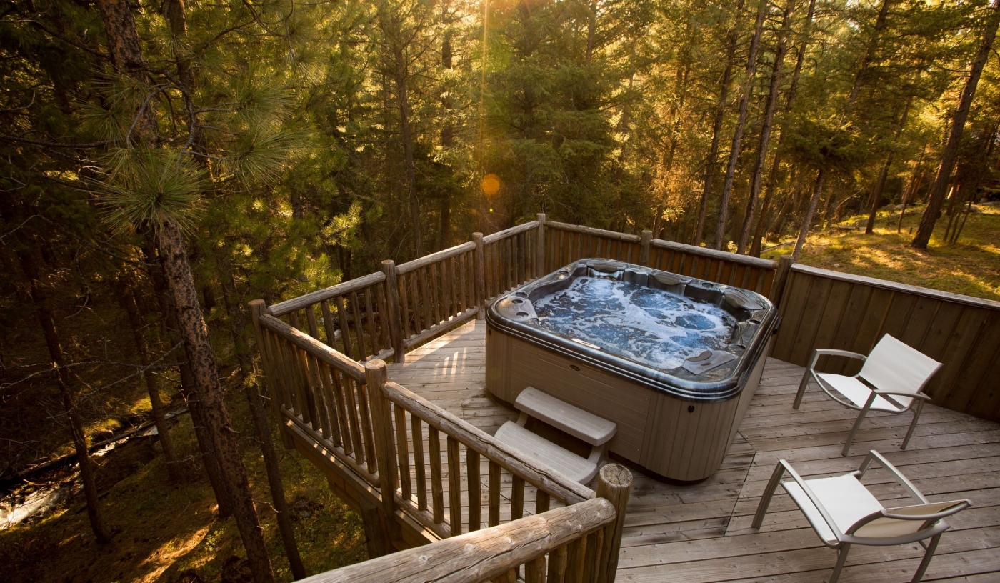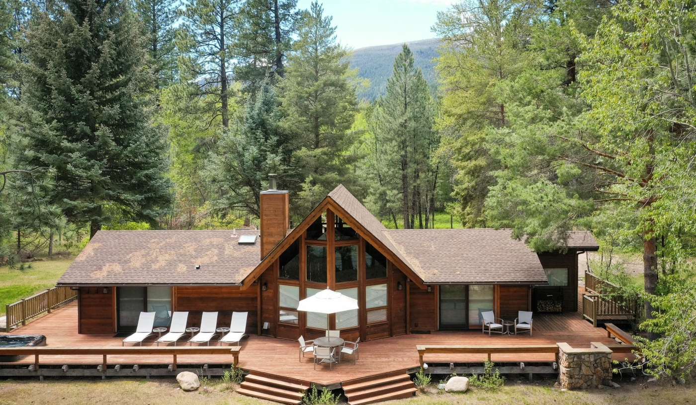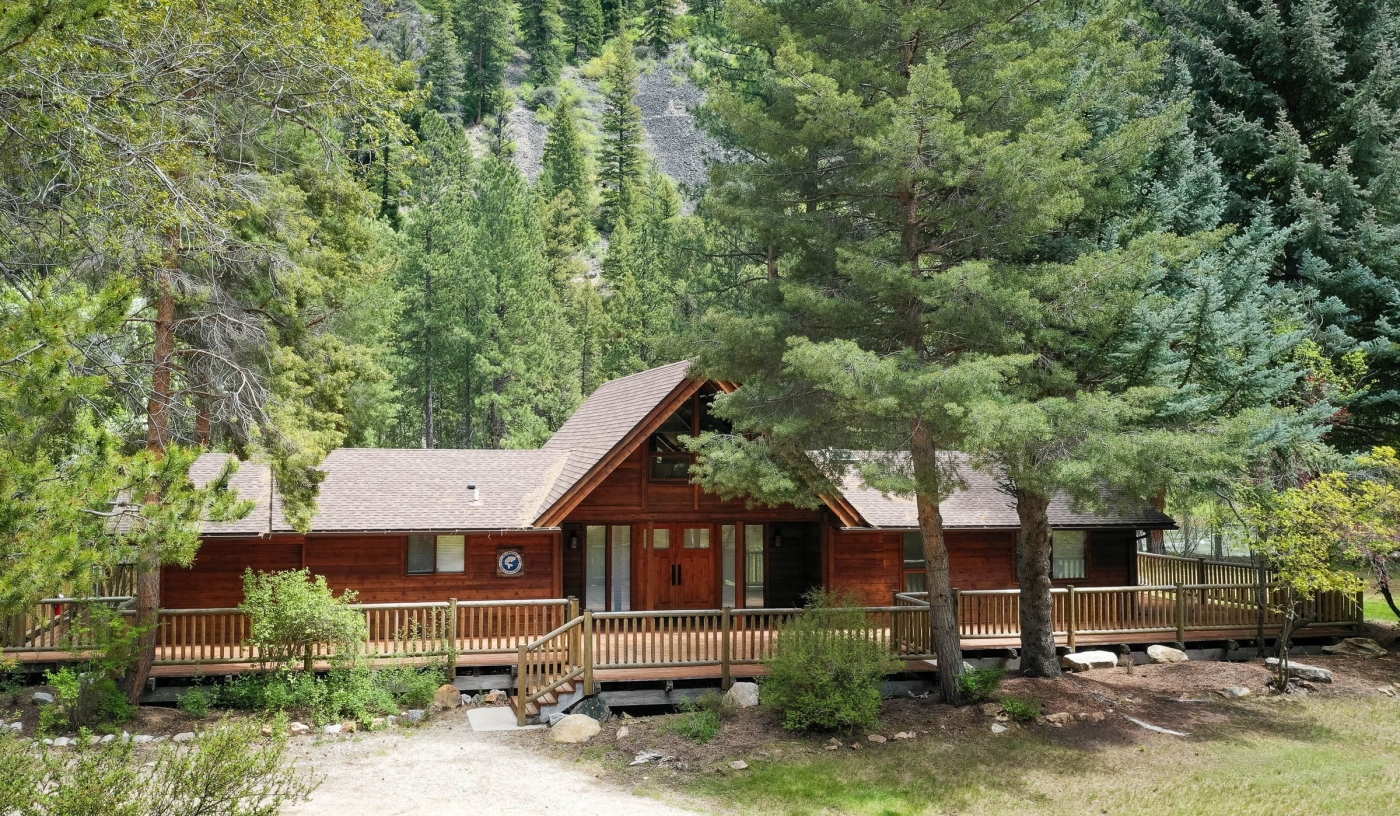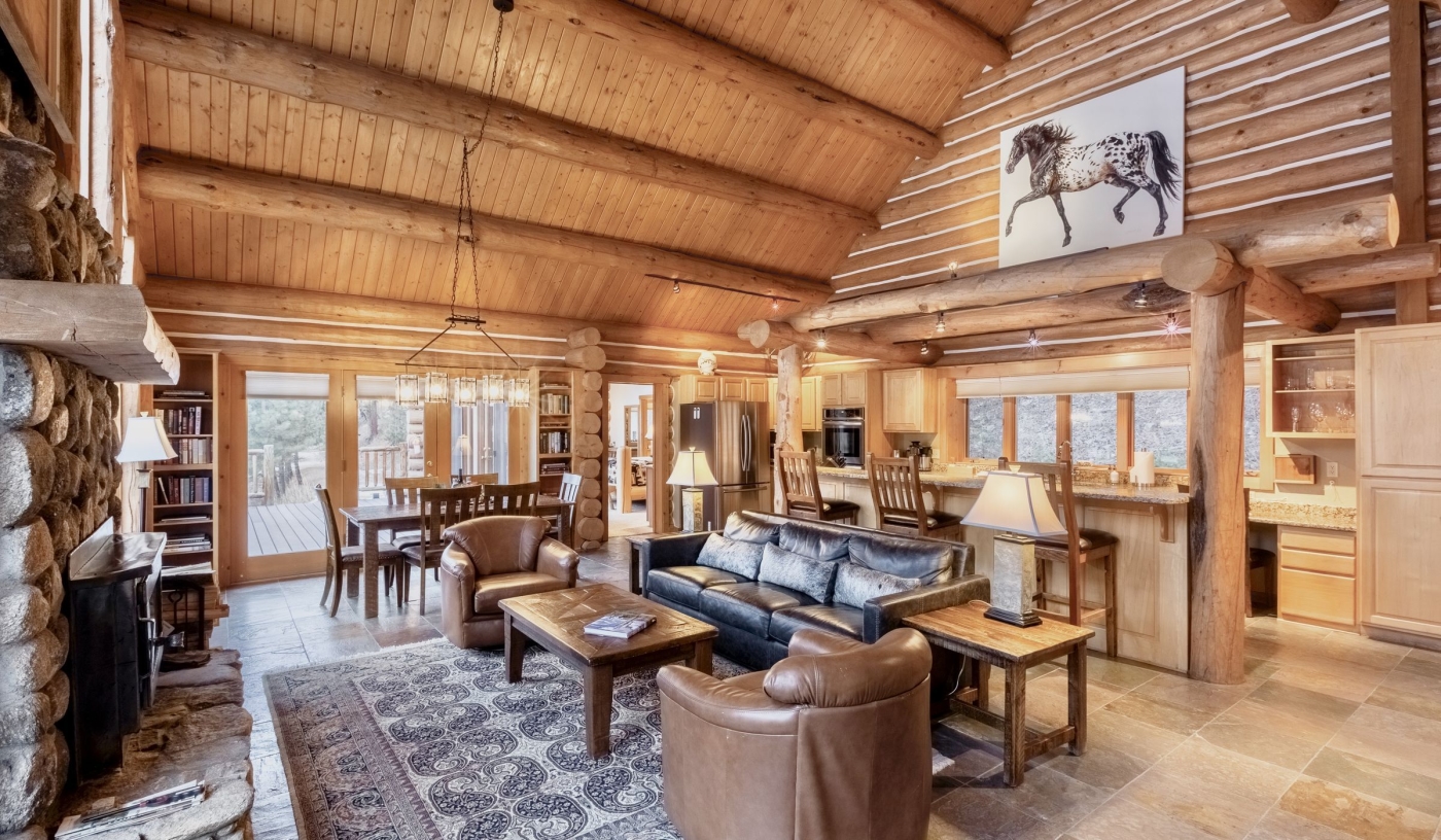 Log cabins and ranch homes are thoughtfully placed among the pines, each with its own fireplace, outdoor hot tub and mountain views