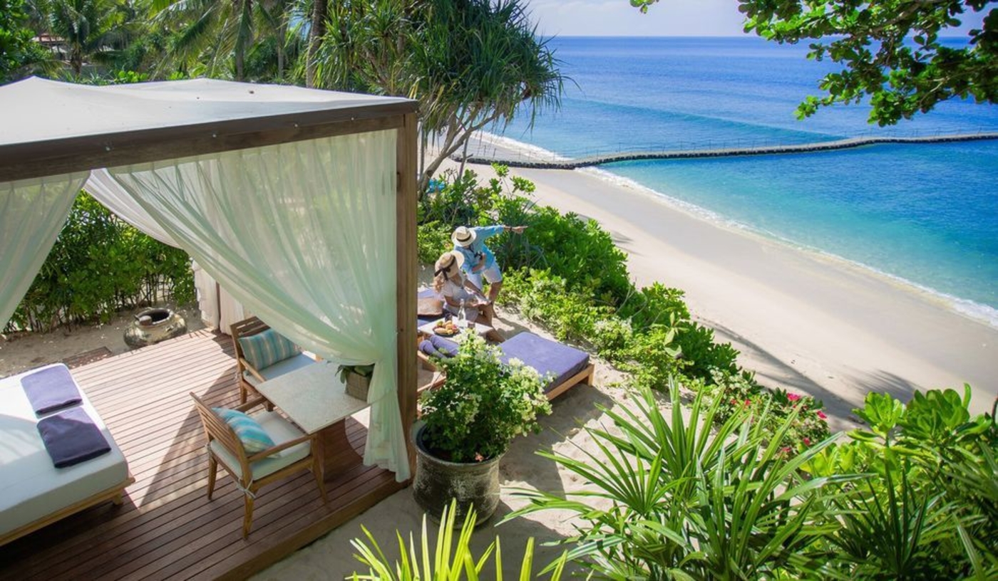 The Jara Spa sits hillside among tropical ponds with six breezy pavilions, the ideal setting for the indulgent six-hand “Royal Trisara” massage