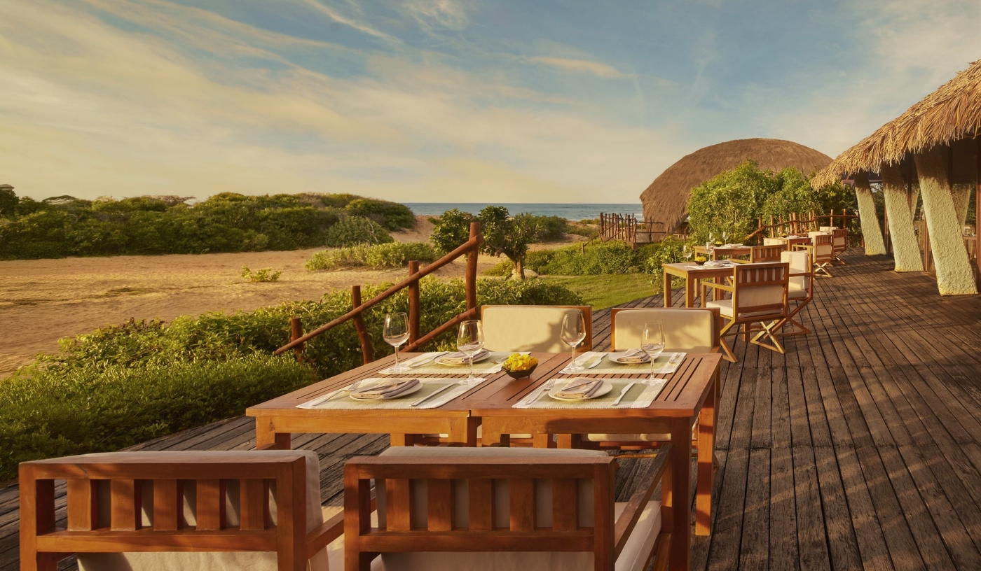 Dining on the raised beachside platform features fish curries and coconut sambals alongside familiar European dishes