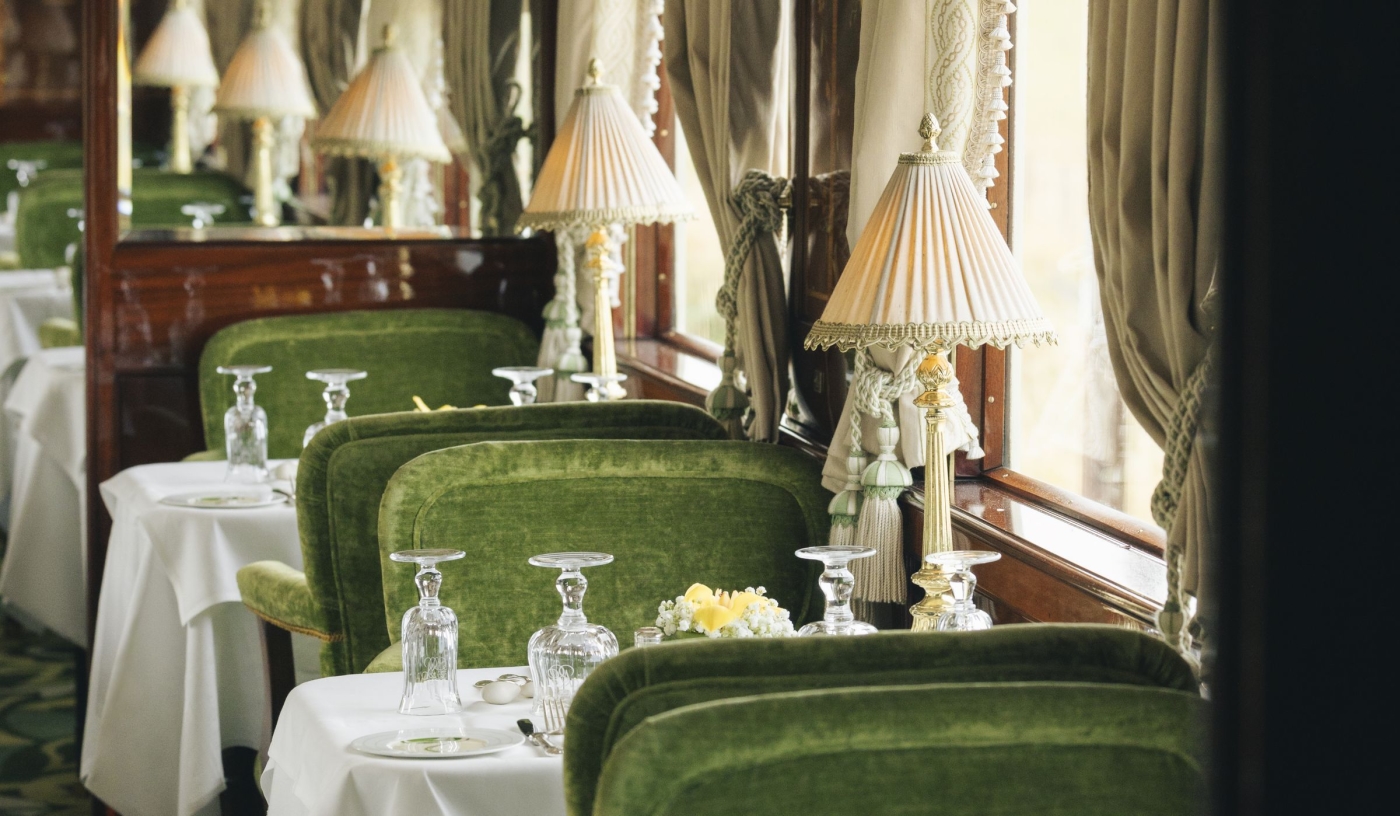 Dining is a decadent affair with seasonal menus served in opulent restaurant cars, accompanied by fine wines and live piano music.