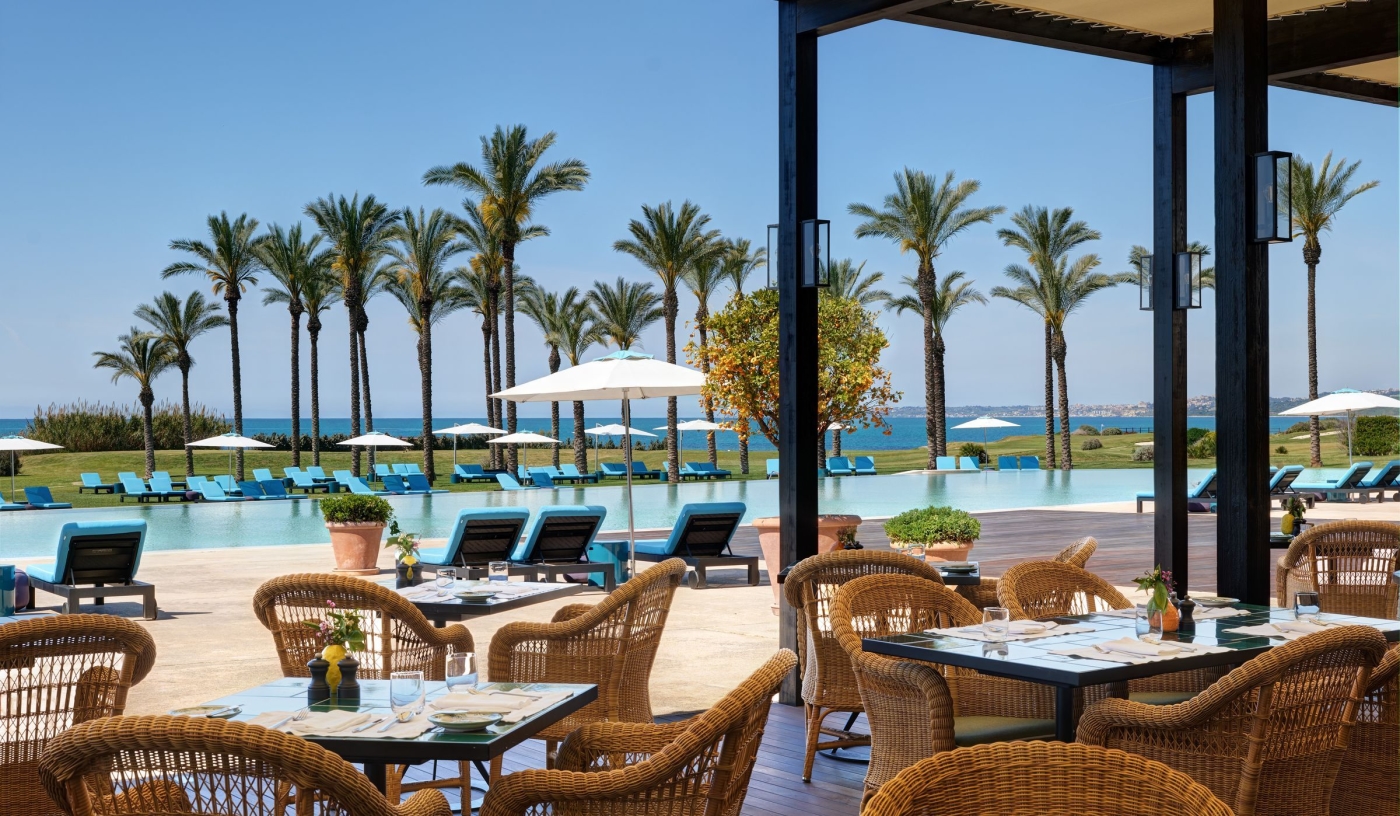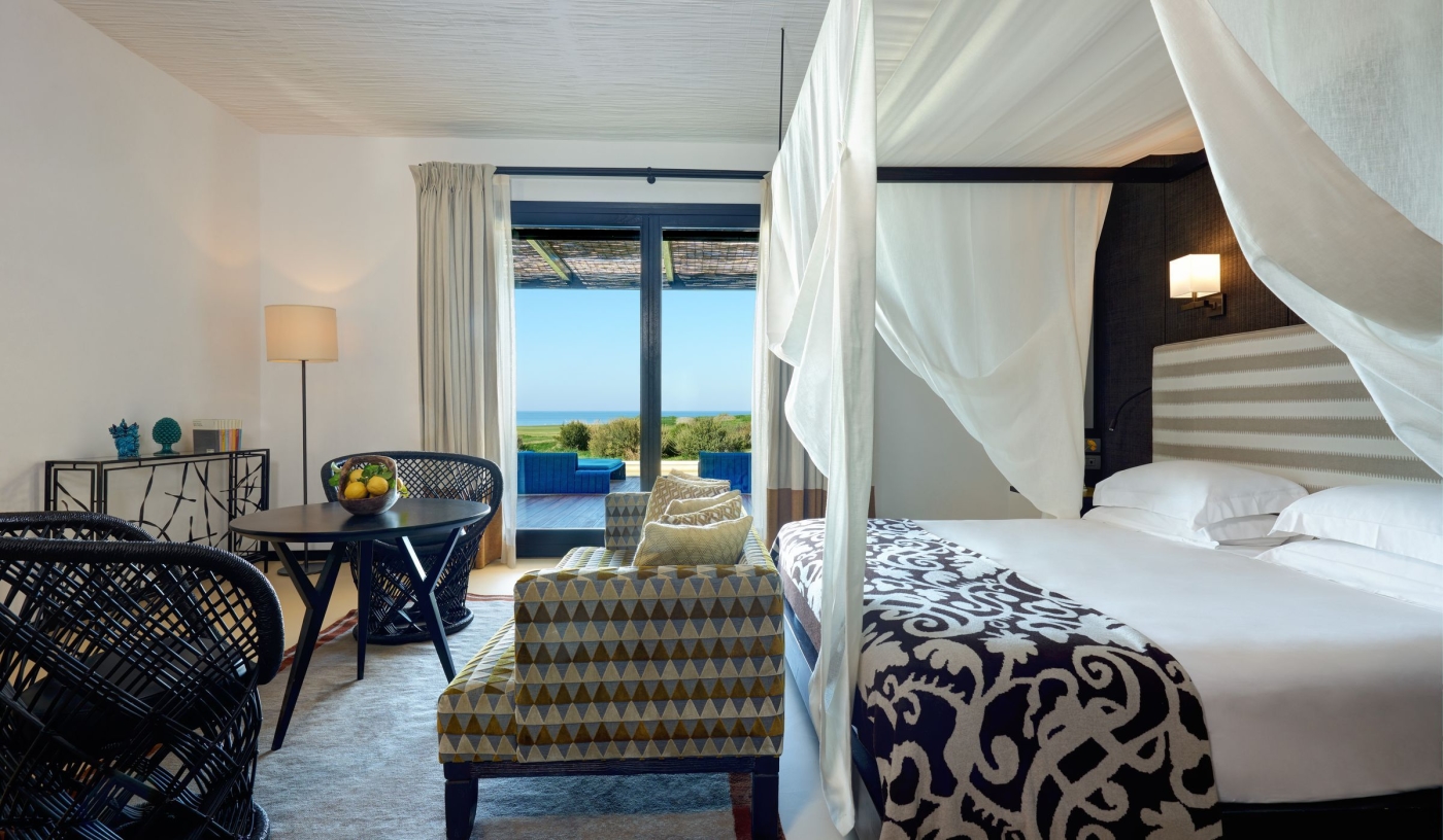 Rooms and suites are light-filled and luxurious, with private terraces and uninterrupted views across the Mediterranean and rolling estate grounds.