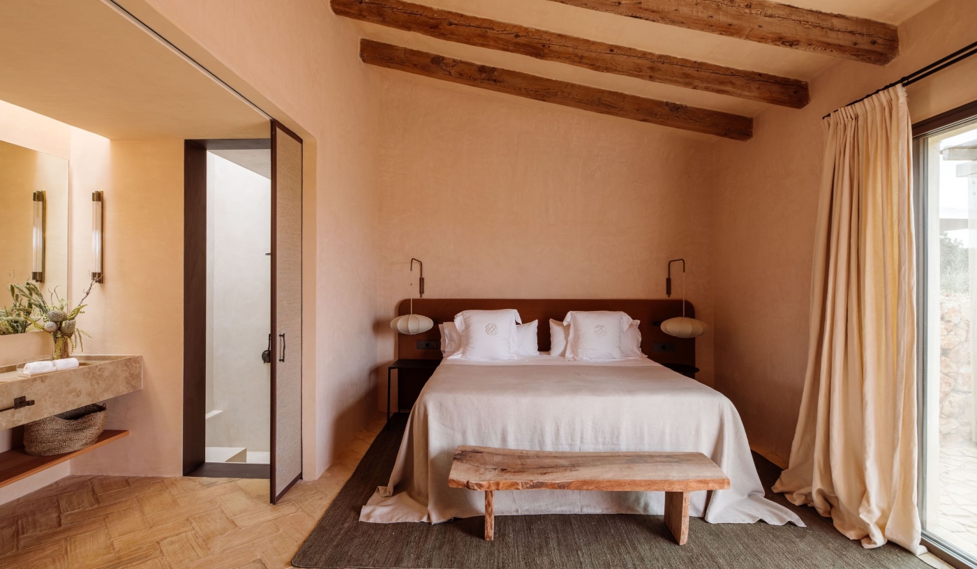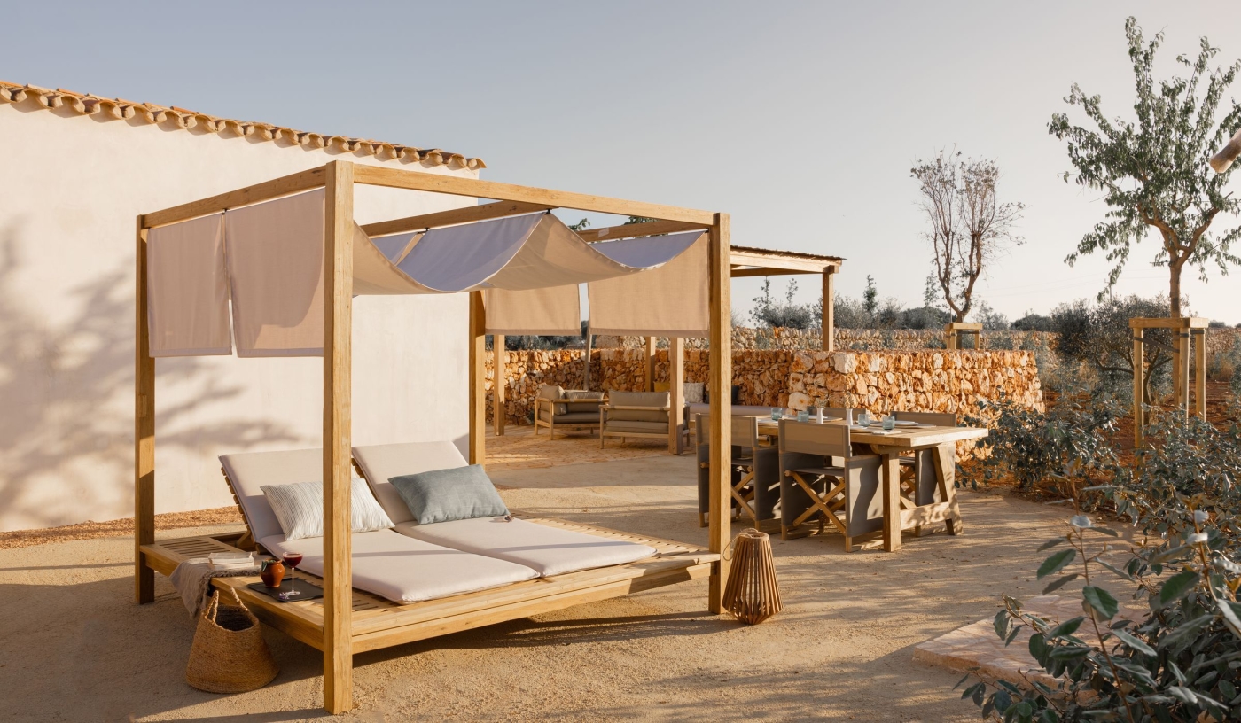 Sleep amid olive groves in historic manor rooms or charming bungalows with natural textures and island soul.