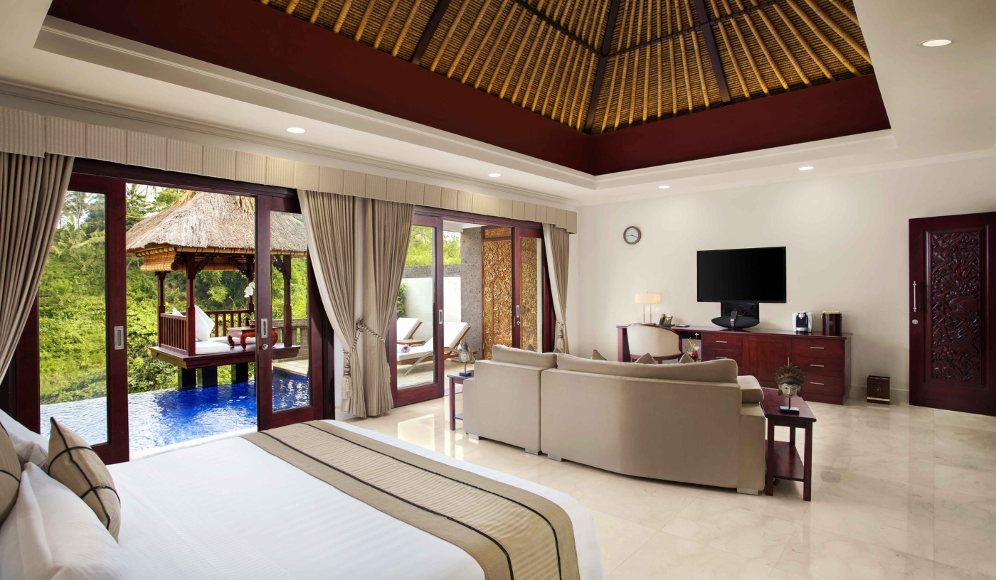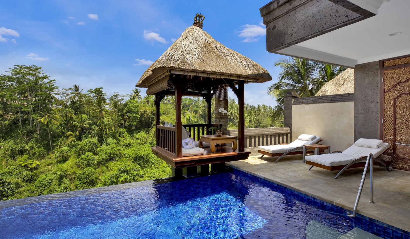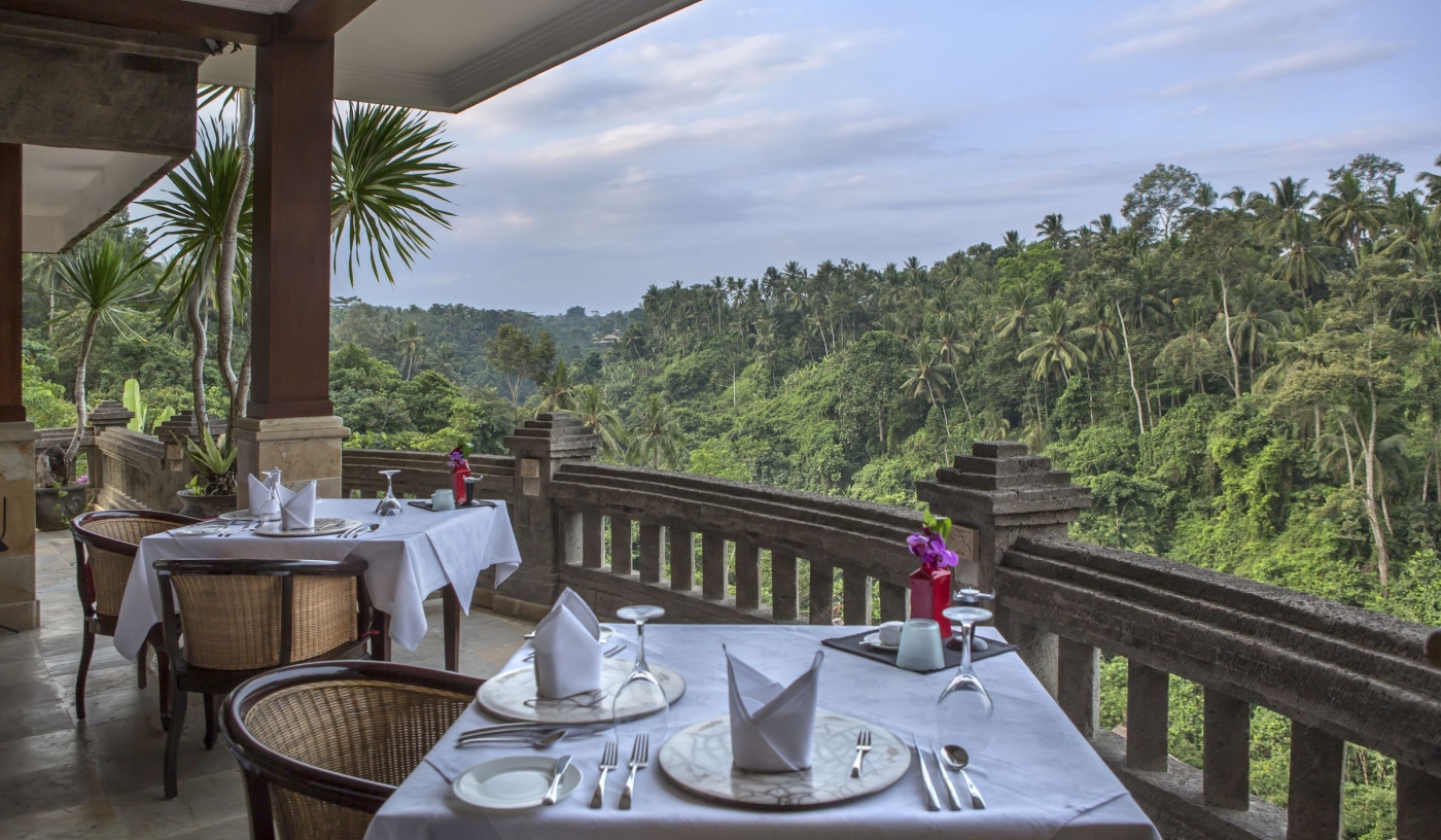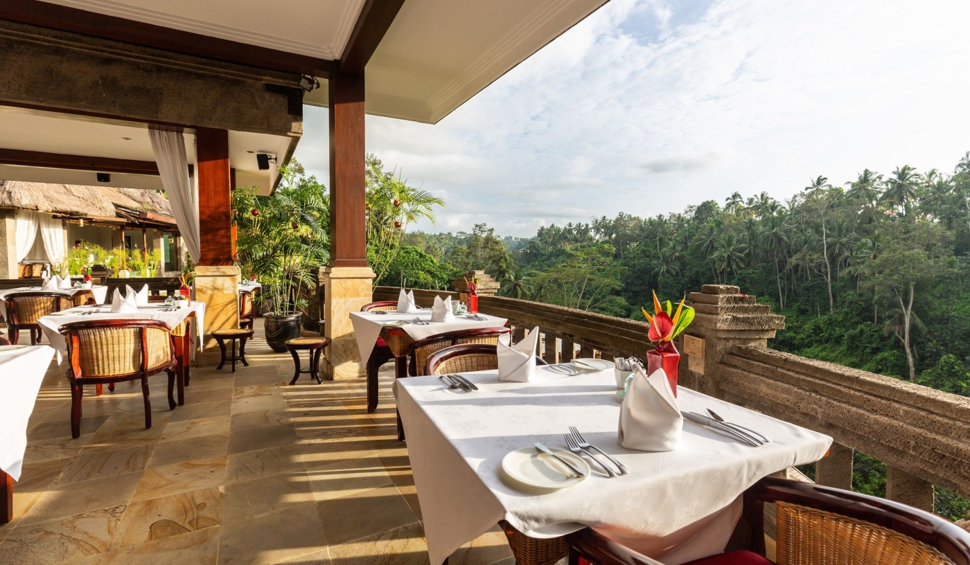 Perched above the Petanu River, the resort offers serene views of rice terraces and palm trees in a luxurious jungle oasis