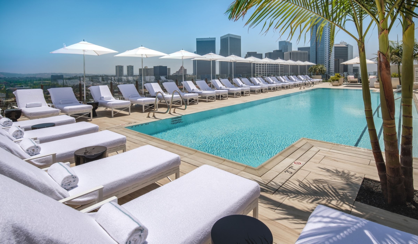 The sun-soaked roof deck includes a restaurant, an alfresco bar, a saltwater pool and a large hot tub tucked away the back, all with panoramic views of the Hollywood Hills.