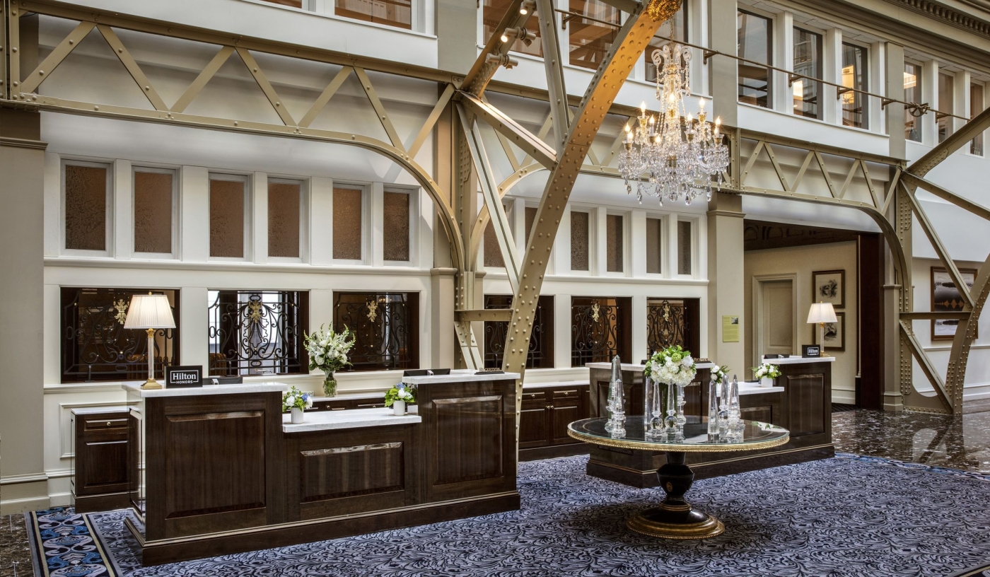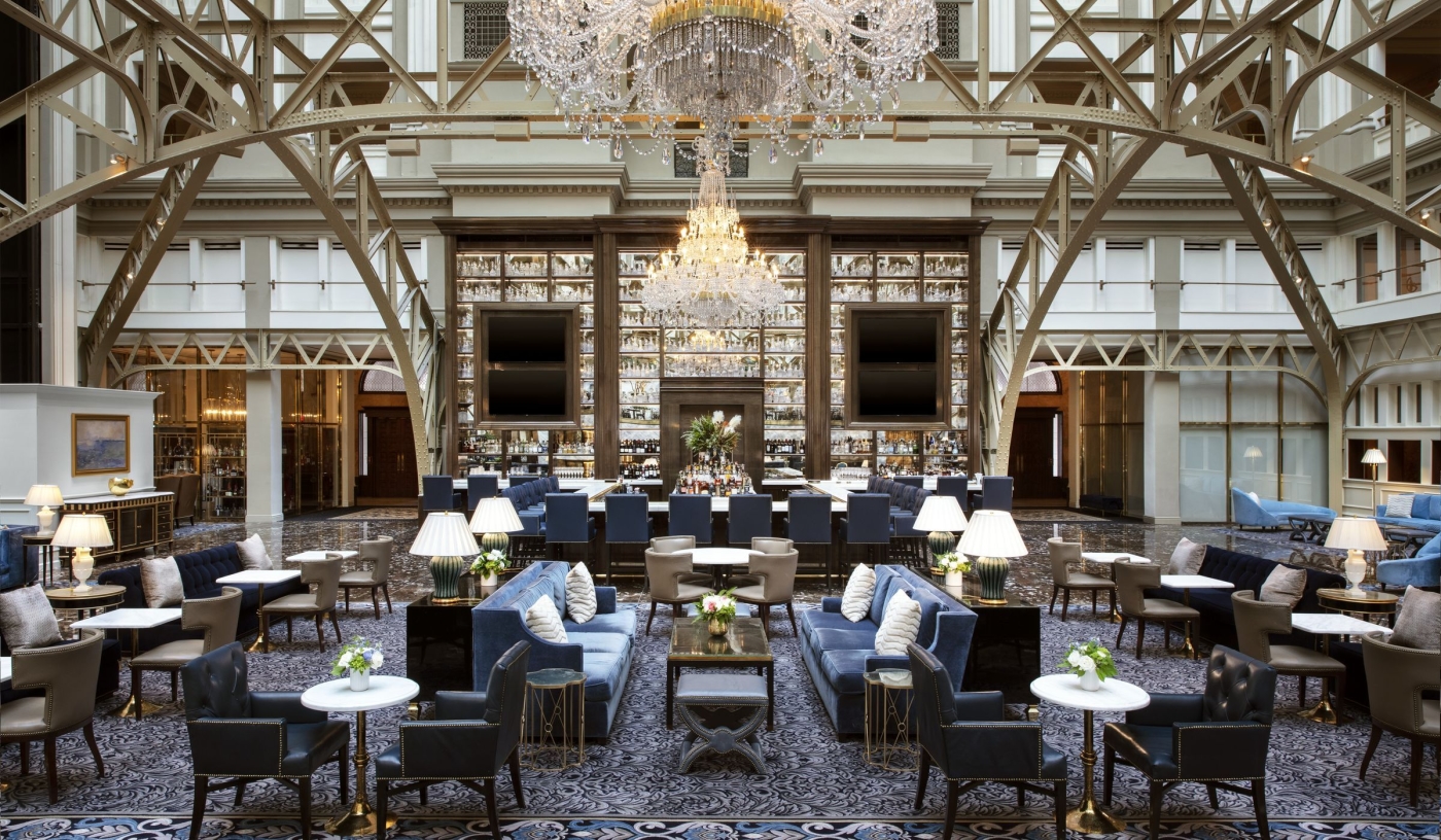 The nine-storey atrium is now the lobby, an impressive space that also holds Peacock Alley, the hotel’s main restaurant.