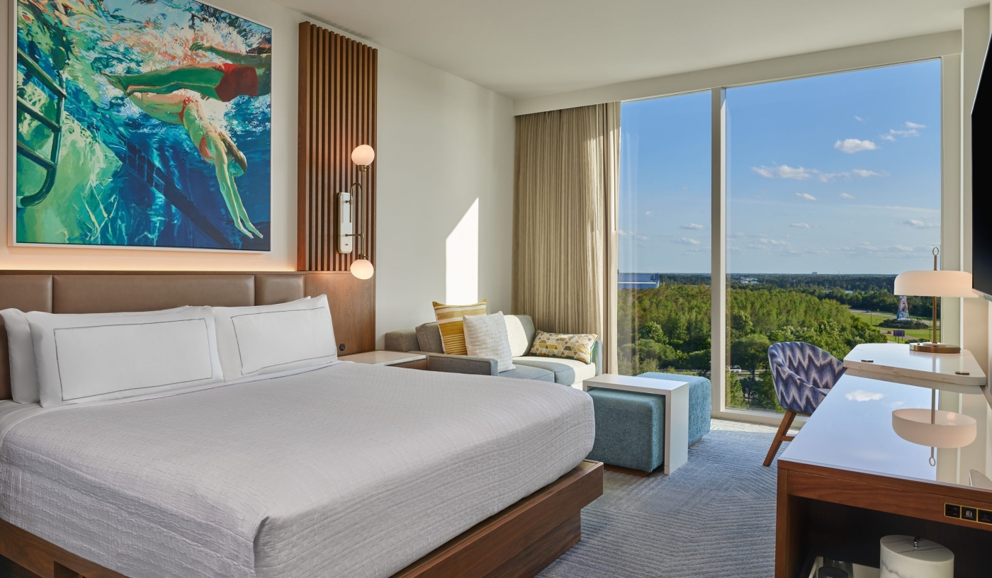 The rooftop and pool deck provide striking views over the Disney skyline, especially at sunset.