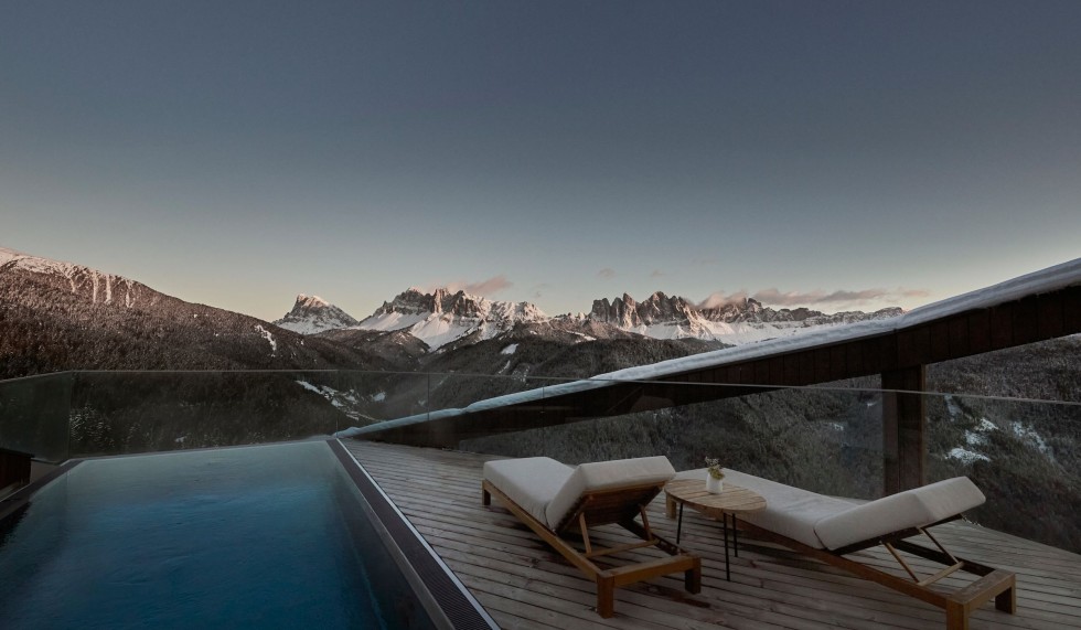 The main building – once used as a retreat from the Vatican for popes during summer – houses the lobby, restaurant and bar, above which rise towers that host the fitness centre, the rooftop bar (one of the highest in the world) and the glorious Tower Suite, whose floor-to-ceiling windows offer direct views of the snaggletooth Dolomite peaks. More impressive still is the two-storey Penthouse, complete with open fireplace, private outdoor pool and spruce wood sauna.