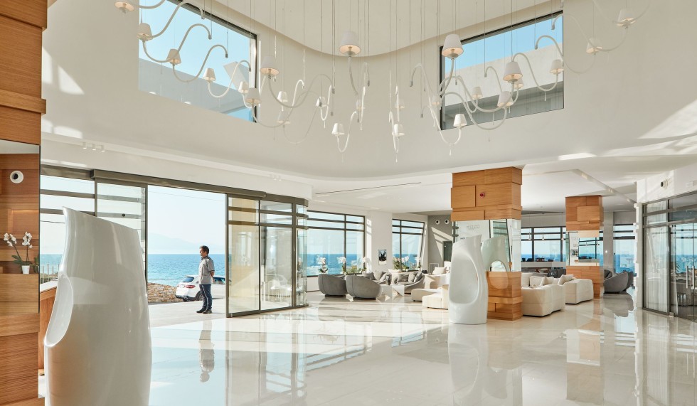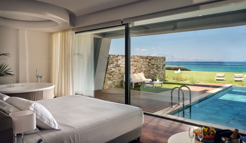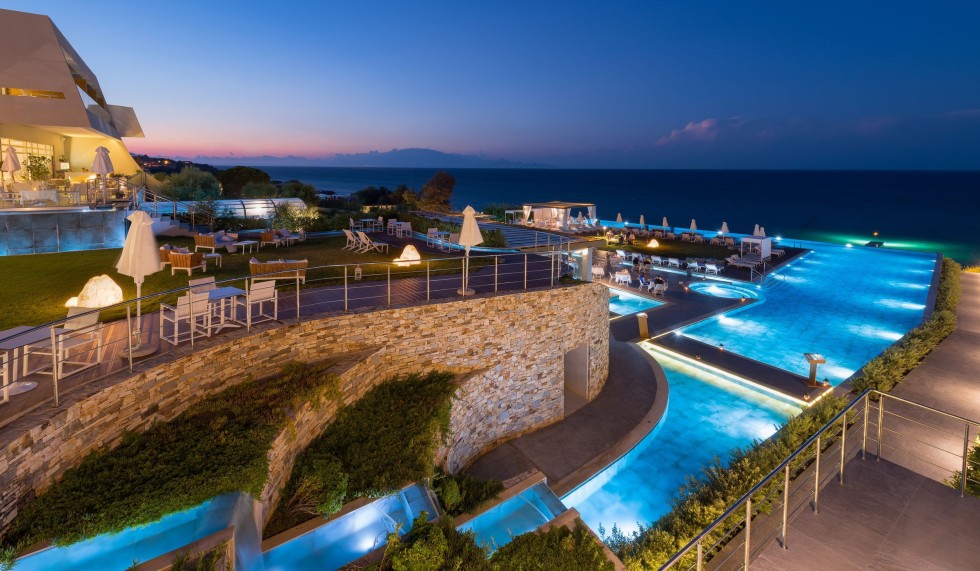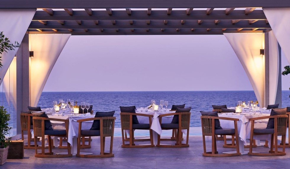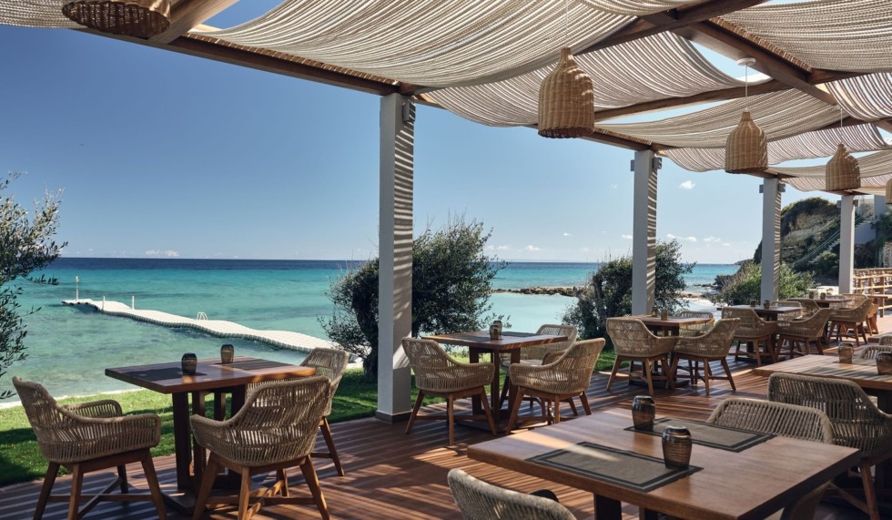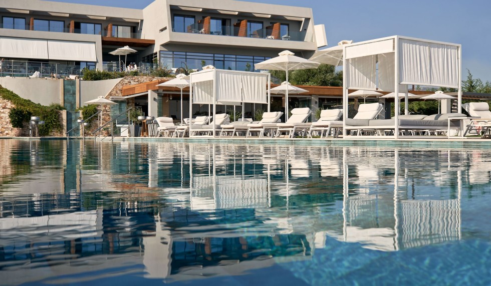 Sun loungers hug the angles of a giant L-shaped infinity pool, egg chairs hang ready for Instagram poses, and neatly clipped lawns descend to a secluded beach with a wooden sundeck on stilts and a jetty stretching far out to sea. The spa offers a wide range of treatments as well as a sauna and hammam, while dining options range from fine-dining restaurant Melia to Greek restaurant Ostria and international restaurant Gaia.