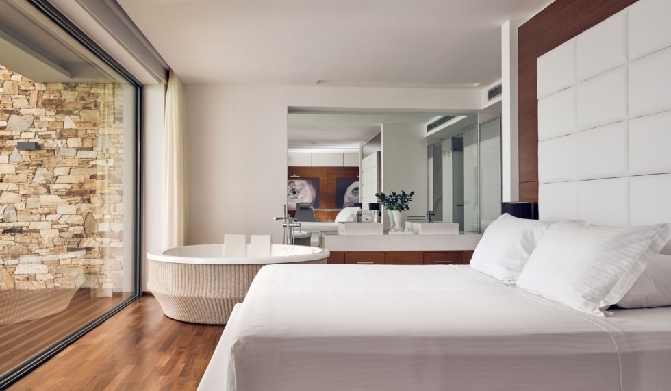 Of the six categories of suites, all have mesmerising sea views and all but one feature either an outdoor hot tub or an inviting private pool. Most are open plan with décor that’s contemporary and stylish yet still anchored to the Greek island aesthetic.
