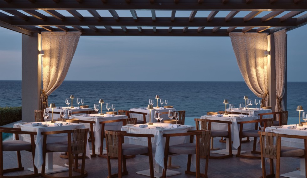 Sun loungers hug the angles of a giant L-shaped infinity pool, egg chairs hang ready for Instagram poses, and neatly clipped lawns descend to a secluded beach with a wooden sundeck on stilts and a jetty stretching far out to sea. The spa offers a wide range of treatments as well as a sauna and hammam, while dining options range from fine-dining restaurant Melia to Greek restaurant Ostria and international restaurant Gaia.