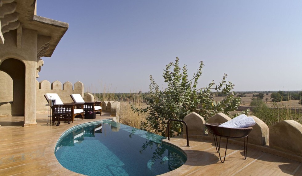 Rising from the rugged beauty of the desert, Mihir Garh fort is an exclusive nine-suite boutique hotel. Here each room treats guests to spacious luxury, as well as private terraces, plunge pools and a jacuzzi. Pamper yourself in the Tulsi Spa, unwind by the pool and dine on delectable cuisine. Rekindle the magic of a royal picnic, take a culinary workshop or head off horse riding or on a village safari.