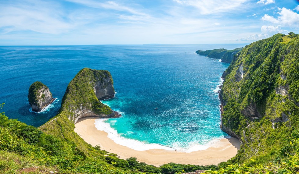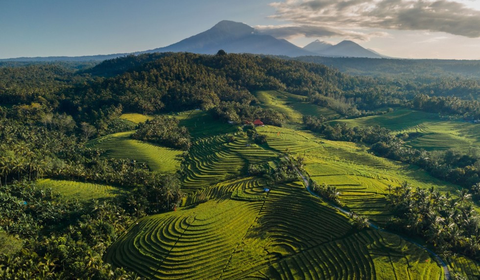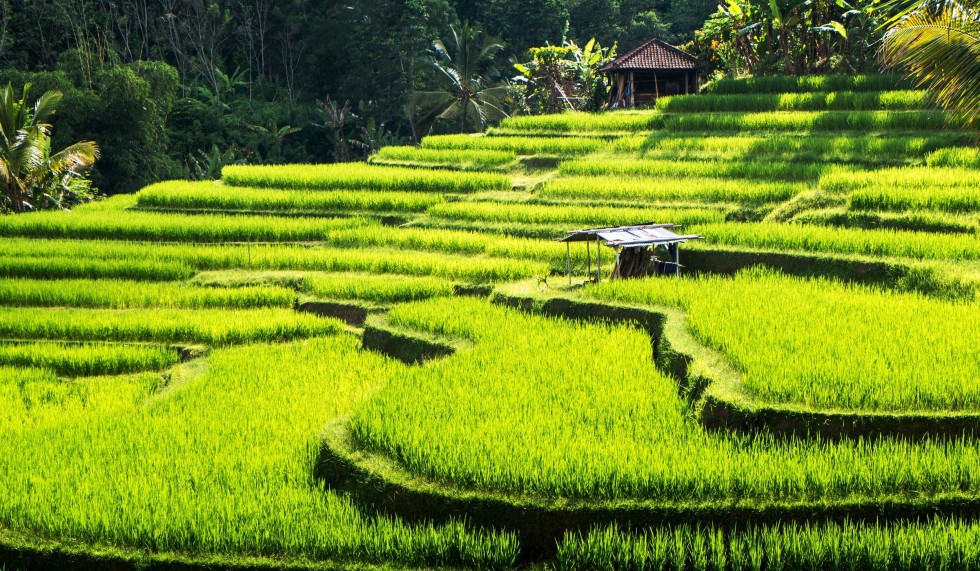 Towering volcanoes revered as domains of Hindu deities give way to emerald-green rice paddies as Bali spreads out towards the warm, inviting waters of the Indian Ocean. The sea pushes back with powerful swells that barrel over reefs to the delight of local surfers and crash upon a coastline of soft-sand beaches.