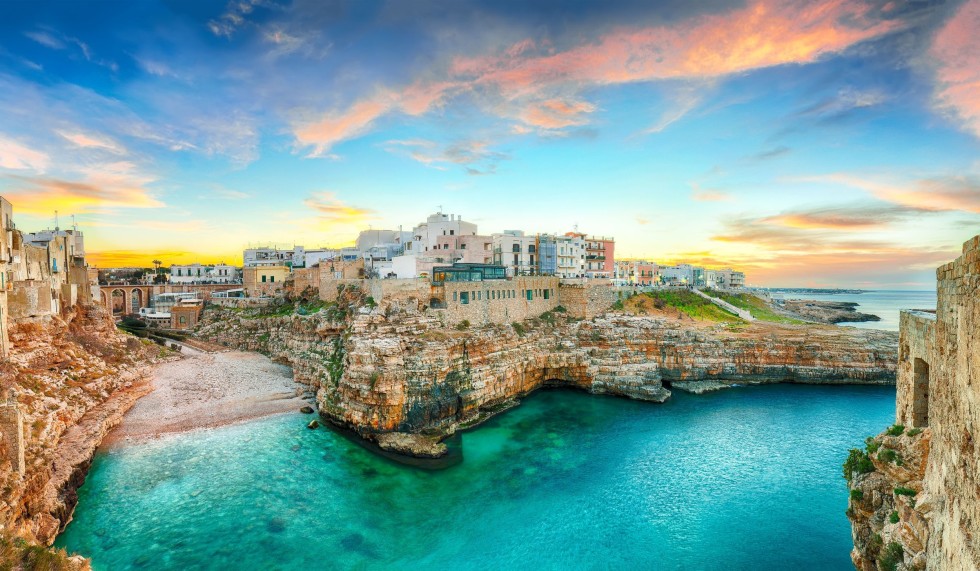 While in the Salento, be sure to explore Lecce, the ‘Florence of the South’, known for its exuberant Baroque architecture, and the whitewashed seaside town of Otranto. Highlights in the north include the stunning ‘white city’ of Ostuni, Baroque Martina Franca, laidback Locorotondo, arguably the prettiest town in Puglia, and Polignano a Mare, an ancient clifftop town known for its stunning views and Blue Flag beach.
